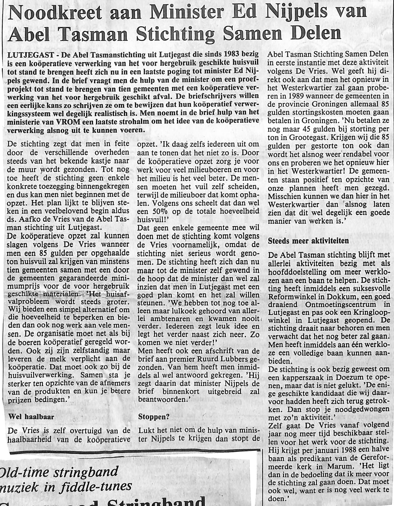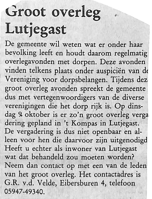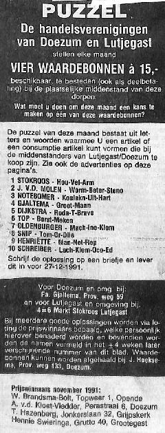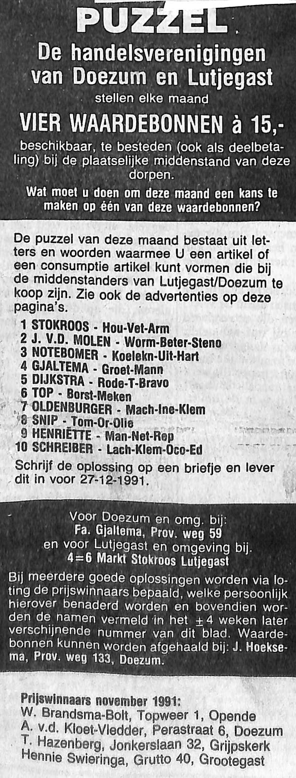 4 waardebonnen van 15,- gulden beschikbaar door de handelsvereniging van Lutjegast en Doezum, bedrijven die meedoen, Stokroos, J.v.d. Molen, Notebomer, Gjaltema, Dijkstra, Top, Oldenburger, Snip, Henriette , Schreiber en winnaars vorige keer,
