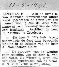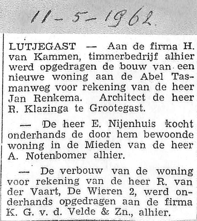 nieuwbouw woning Abel Tasmanweg voor Jan Renkema, E. Nijenhuis koopt reeds bewoond huis in Mieden en woning De Wieren 2 van R. van der Vaart wordt verbouwd