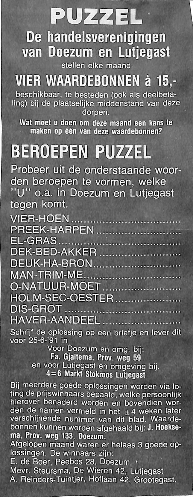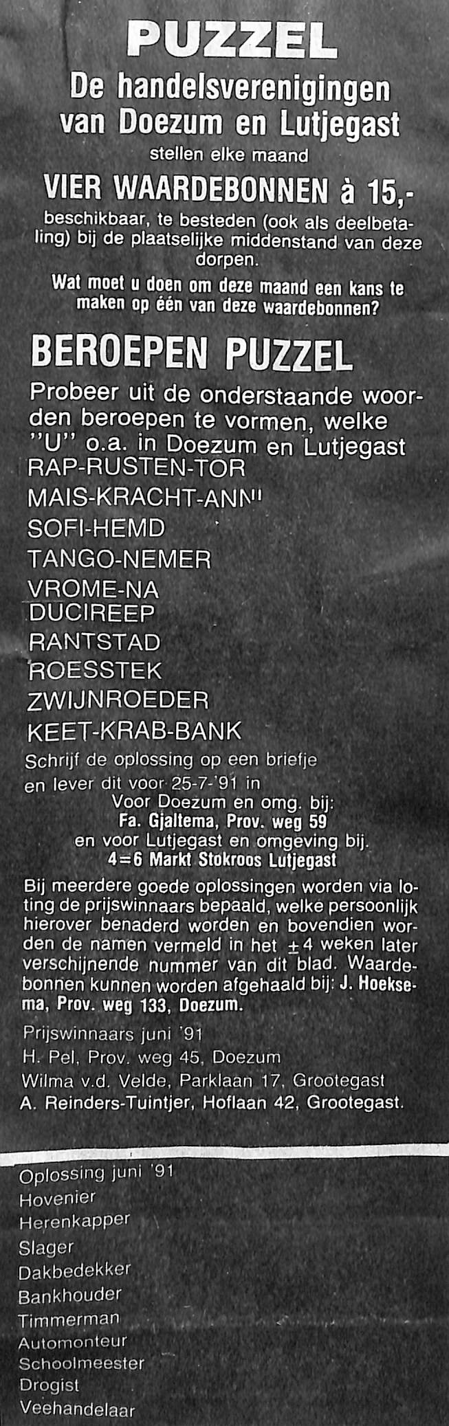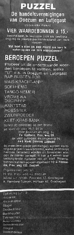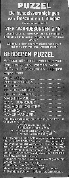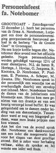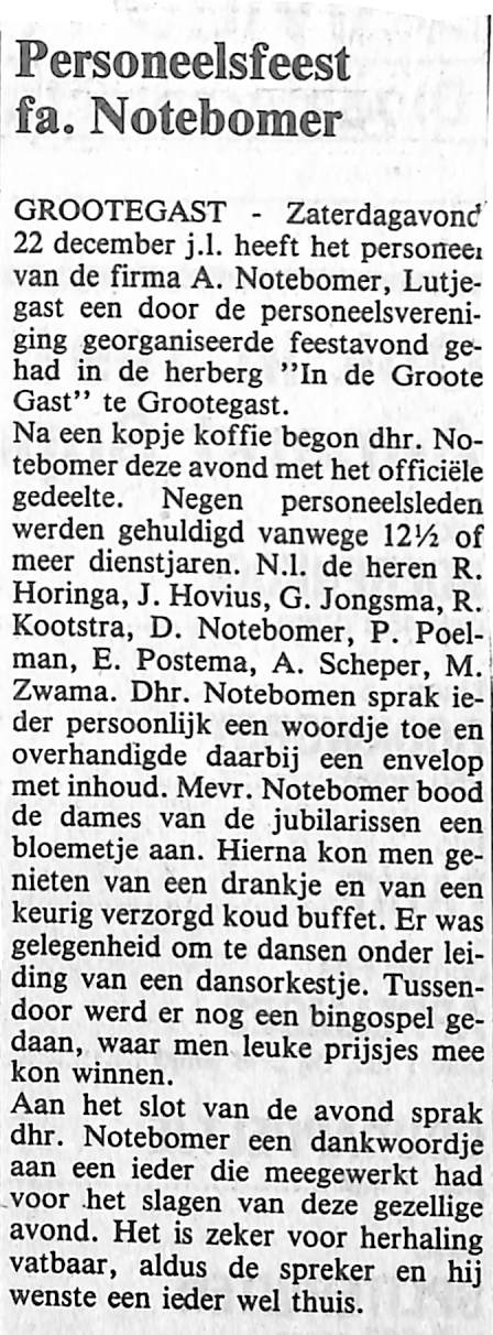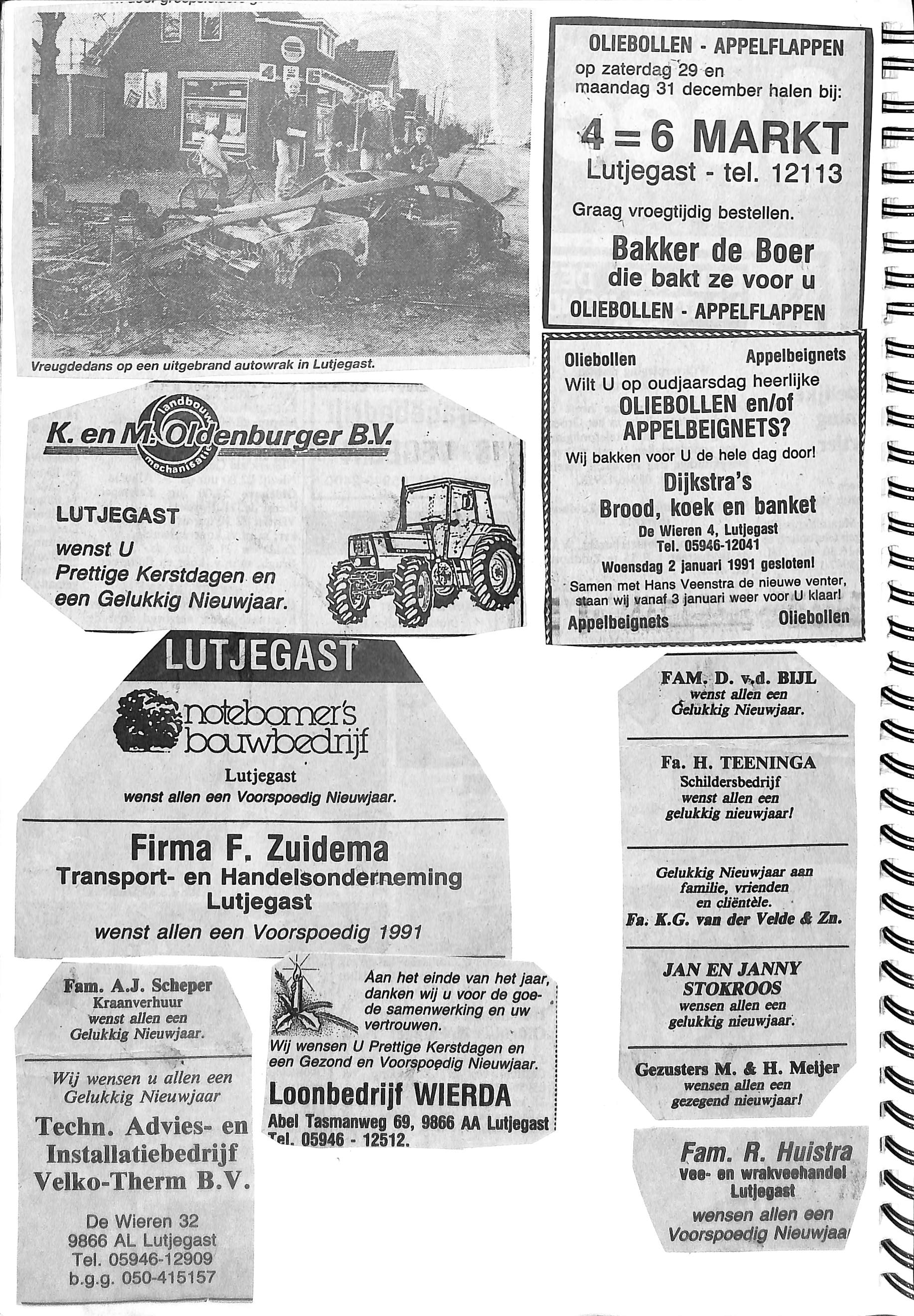 nieuwjaarswensen; K. en M. Oldenburger, Notebomer's bouwbedrijf, Firma F. Zuidema, A. J. Scheper, Velko-Therm B.V., loonbedrijf Wierda, D. v/d Bijl, H. Teeninga, firma K. G. v/d Velde &Zn, Jan en Janny Stokroos, M. en H. Meijer, R. Huistra