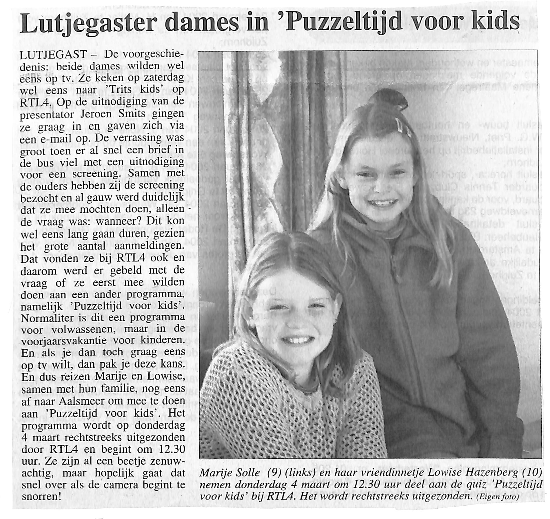 Emely ( groep 6) Wout-Jan (groep 4) Janco Visser (groep 7) Sarina Holtrop (groep 7) Dennis Wierda (groep 5) Greanne (groep 8) Agnetta (groep 8) Regine en Derwin (groep 4) Silvienne en Angela (groep 4) Melina (groep 4) Danny Aalders (groep 4) Bart (groep 6) Corine (groep 7)