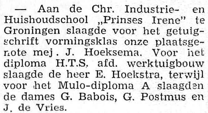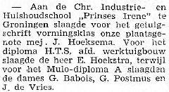mej. J. Hoeksema slaagt voor het getuigschrift vormingsklas aan de Chr. Industrie- en Huishoudschool te Groningen