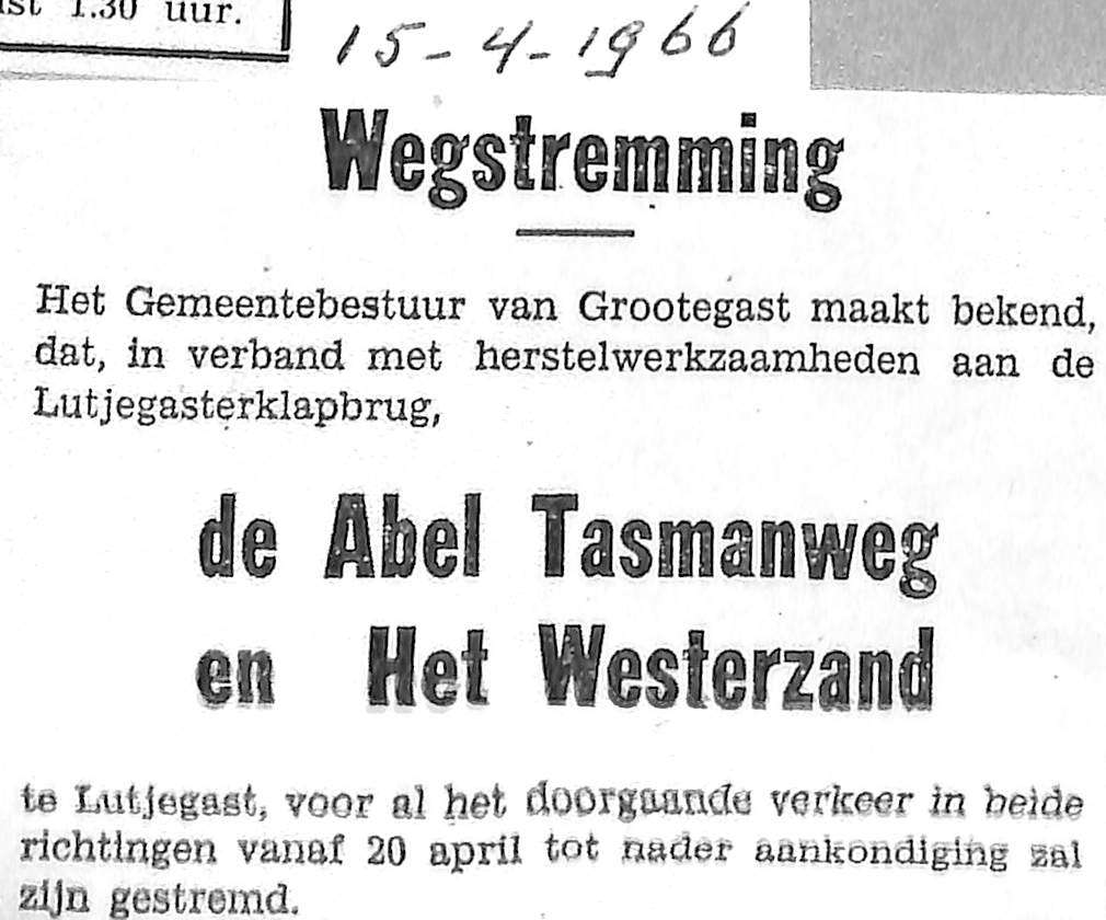 Abel Tasmanweg en Het Westerzand zullen worden afgesloten i.v.m. herstelwerkzaamheden aan de Lutjegasterklapbrug