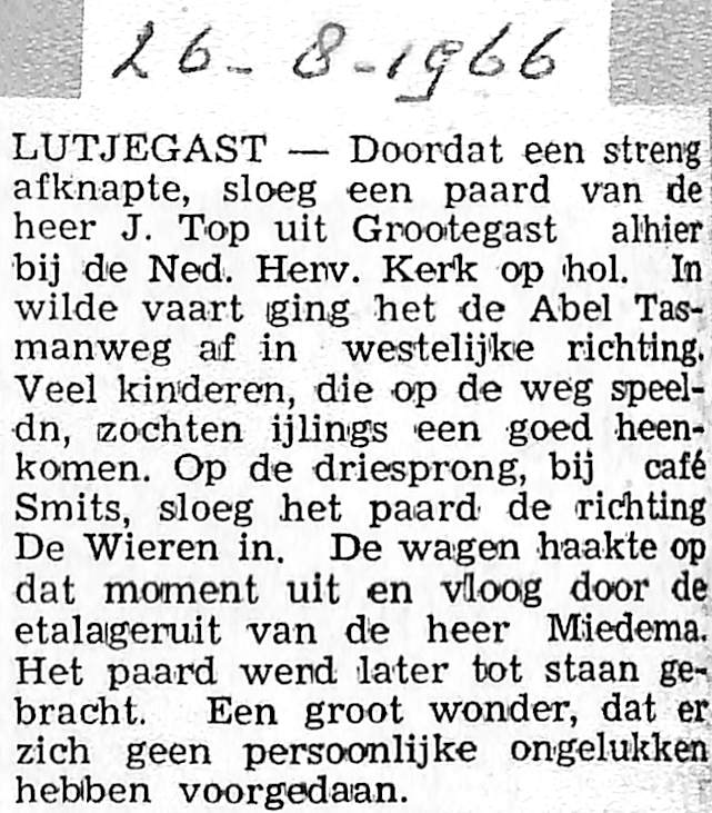 paard en wagen op hol geslagen bij Herv. Kerk, bij driesprong café Smits gaat het De Wieren op en verliest wagen in de bocht, wagen vliegt bij Miedema door de winkelruit