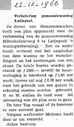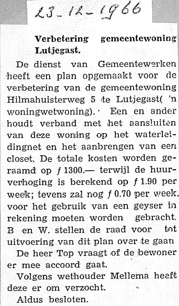 Besluit om woningwetwoning Hilmahuisterweg 5 aan te sluiten op het waterleidingnet en te voorzien van een closet.