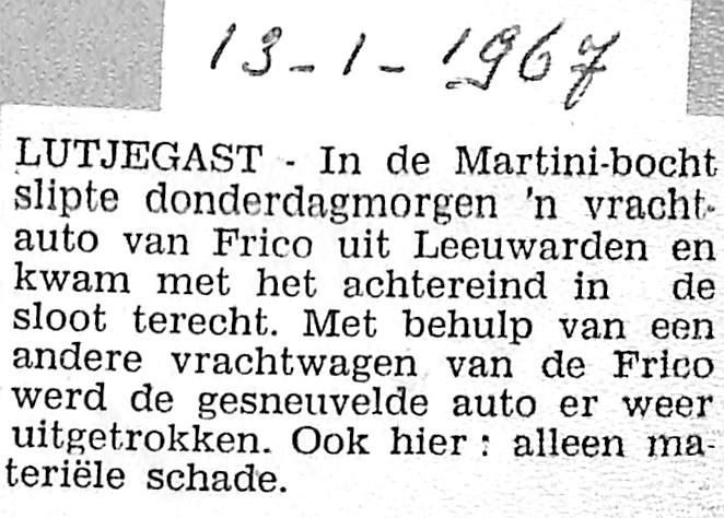 Vrachtauto van Frico bij Martini uit de bocht en met achtereind in de sloot, door andere vrachtauto van Frico er weer uitgehaald; alleen materiële schade