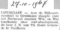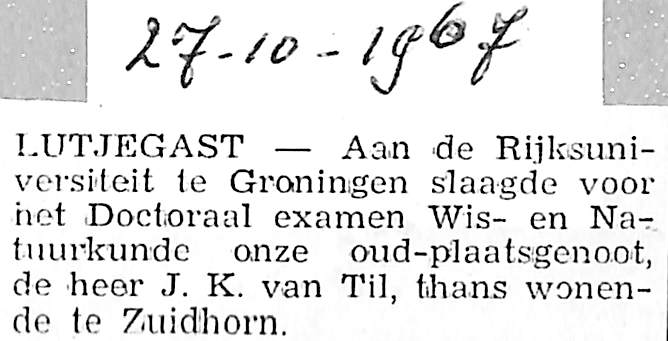 oud-plaatsgenoot, thans wonend te Zuidhorn, is geslaagd voor het Doctoraal examen Wis- en Natuurkunde aan de Rijksuniversiteit te