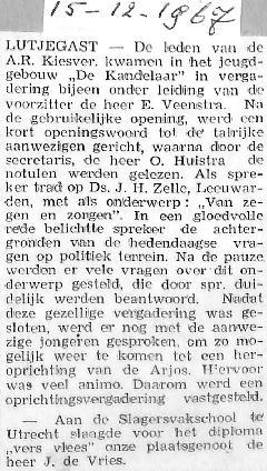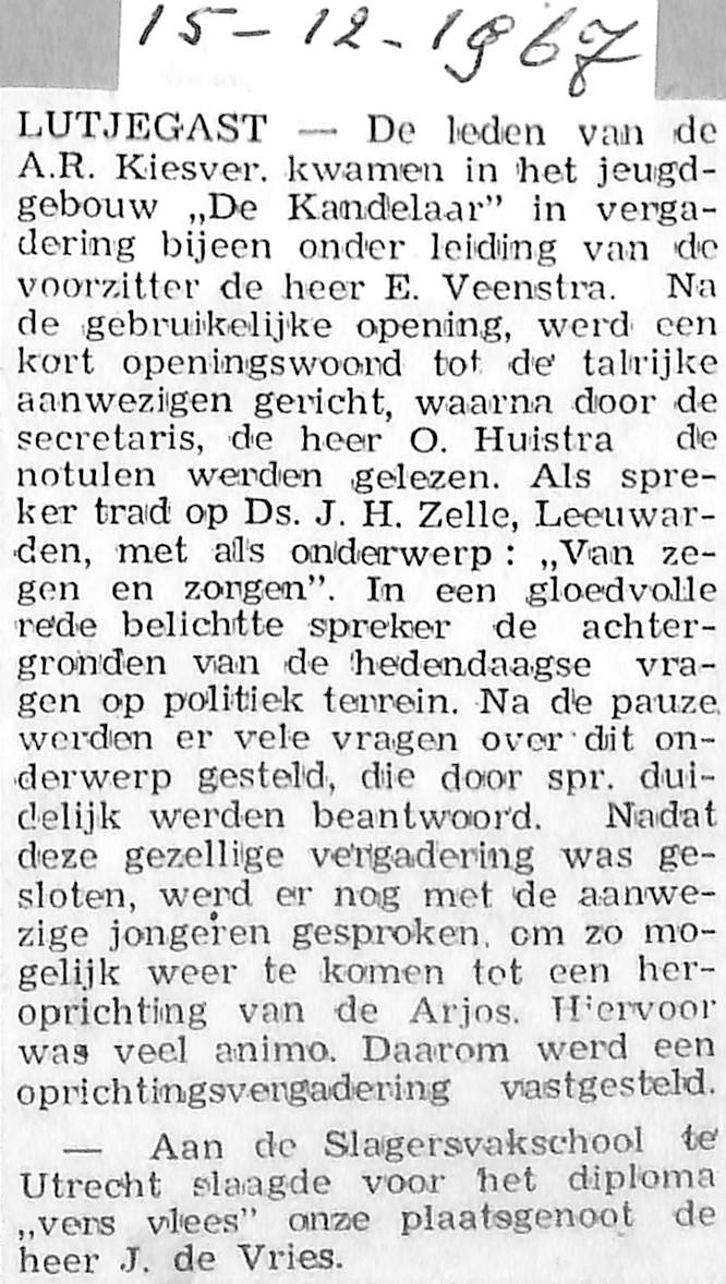Betoog ds Zelle "Van zegen en zorgen" over hedendaagse politiek. Met jeugd gesproken over heroprichting van de Arjos. Oprichtingsvergadering vastgsteld