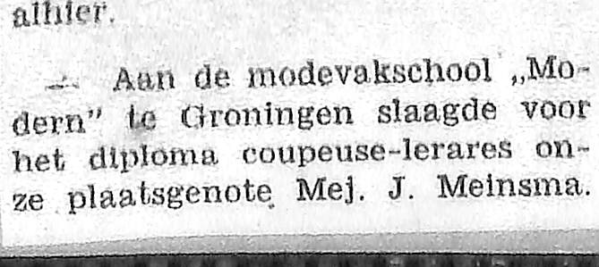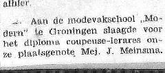Jantje Meinsma haalt diploma coupeuse-lerares aan modevakschool "Modern" te Groningen