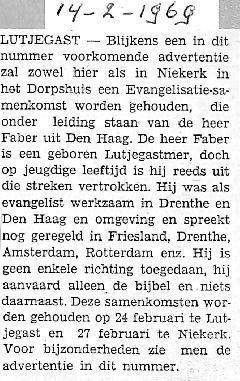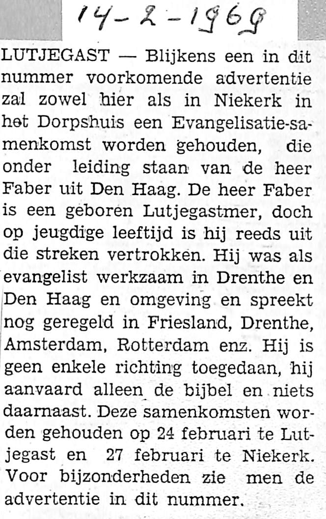 evangelist Faber spreekt in dorpshuizen Lutjegast en Niekerk