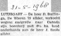 Doeke Buffinga verkoopt boerderij De Wieren 79 aan Jan Smits i.v.m. emigratie naar Canada