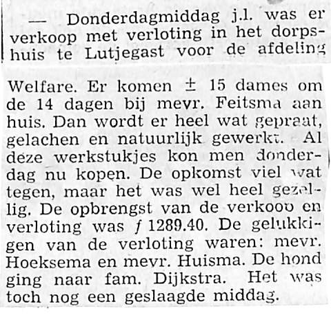 Hoeksema, Huisma, Dijkstra, Feitsma verloting bracht f 1289,40 op