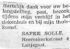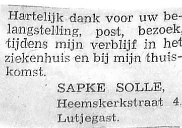 dank voor belangstelling in het ziekenhuis, Sapke Solle