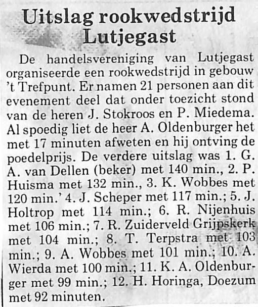 uitslagen rookwedsrtijd; J. Stokroos, P. Miedema, A. Oldenburger, A. van Dellen, P. Huisma, K. Wobes, J. Scheper, J. Holtrop, R. Nijenhuis, R. Zuiderveld, T. Terpstra, A. Wobbes, A. Wierda, K. A. Oldenburger, H. Horinga,