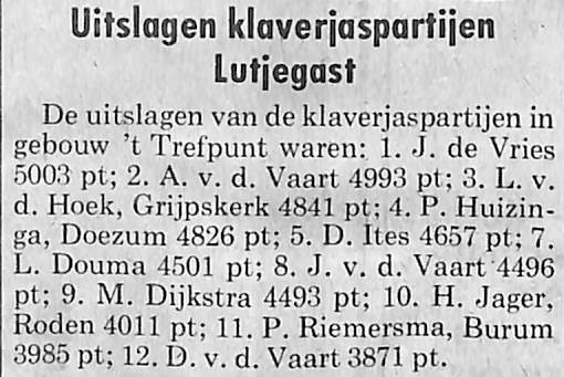 uitslagen klaverjaspartijen; J. de Vries, A. v/d Vaart, L. v/d Hoek P. Huizinga, D. Ites, L. Douma, J. v/d Vaart, M. Dijkstra, H. Jager, P. Riemersma
