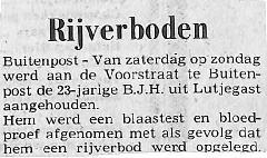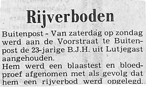 voor B.J.H. uit Lutjegast rijverbod wegens alcoholmisbruik