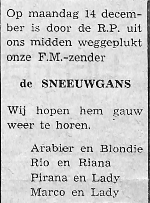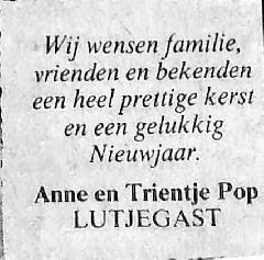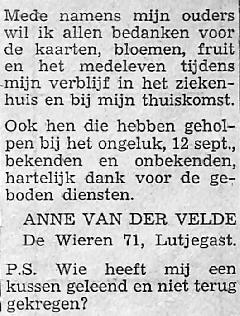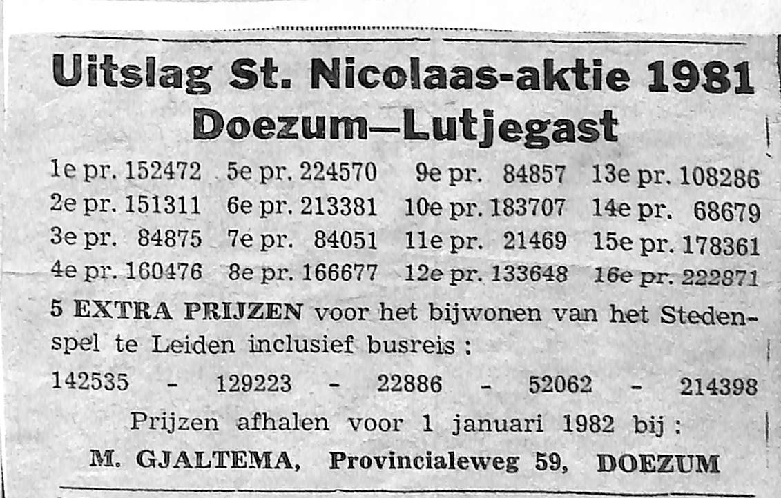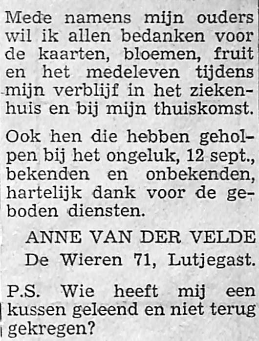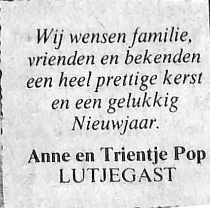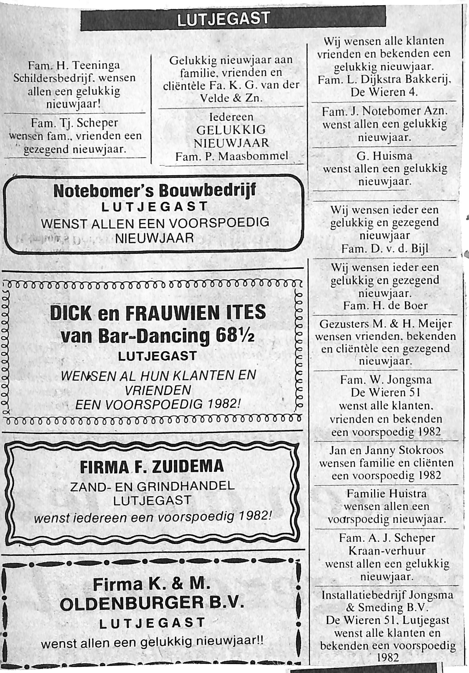 Teeninga, K. v.d. Velde, L. Dijkstra, Tj. Scheper, Maasbommel Notebomer, G. Huisma, D. v.d. Bijl, H. de Boer, M. en H. Meijer, W. Jongsma, Dick en Frauwien Ites, Jan en Janny Stokroos, Familie Huistra, Fam A.J. Scheper, Jongsma en Smeding, F. Zuidema, K. en M. Oldenburger