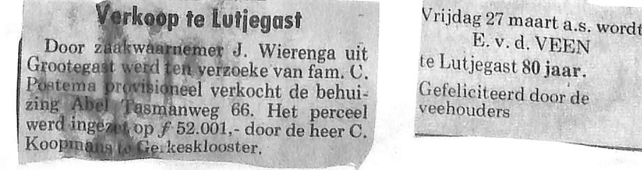 verkoop huis van de fam. C. Postema; J. Wierenga