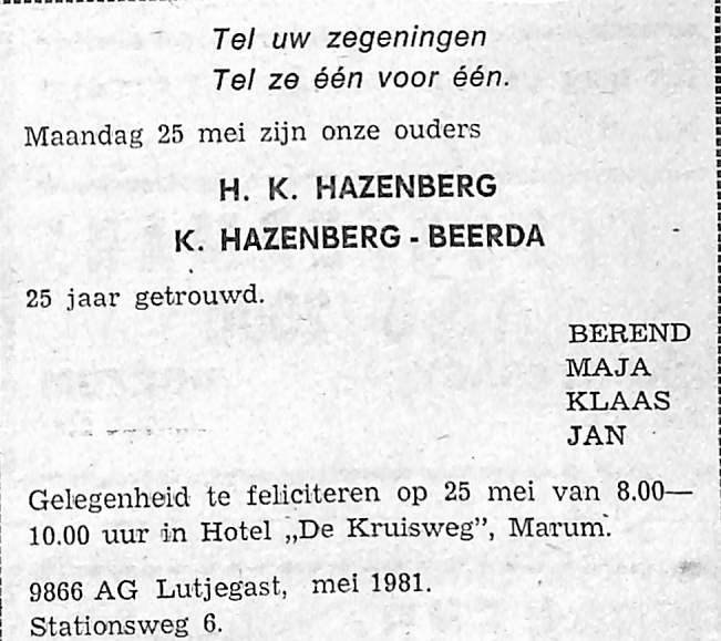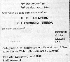H. K. Hazenberg en K hazenberg-Beerda zijn 25 jaar getrouwd