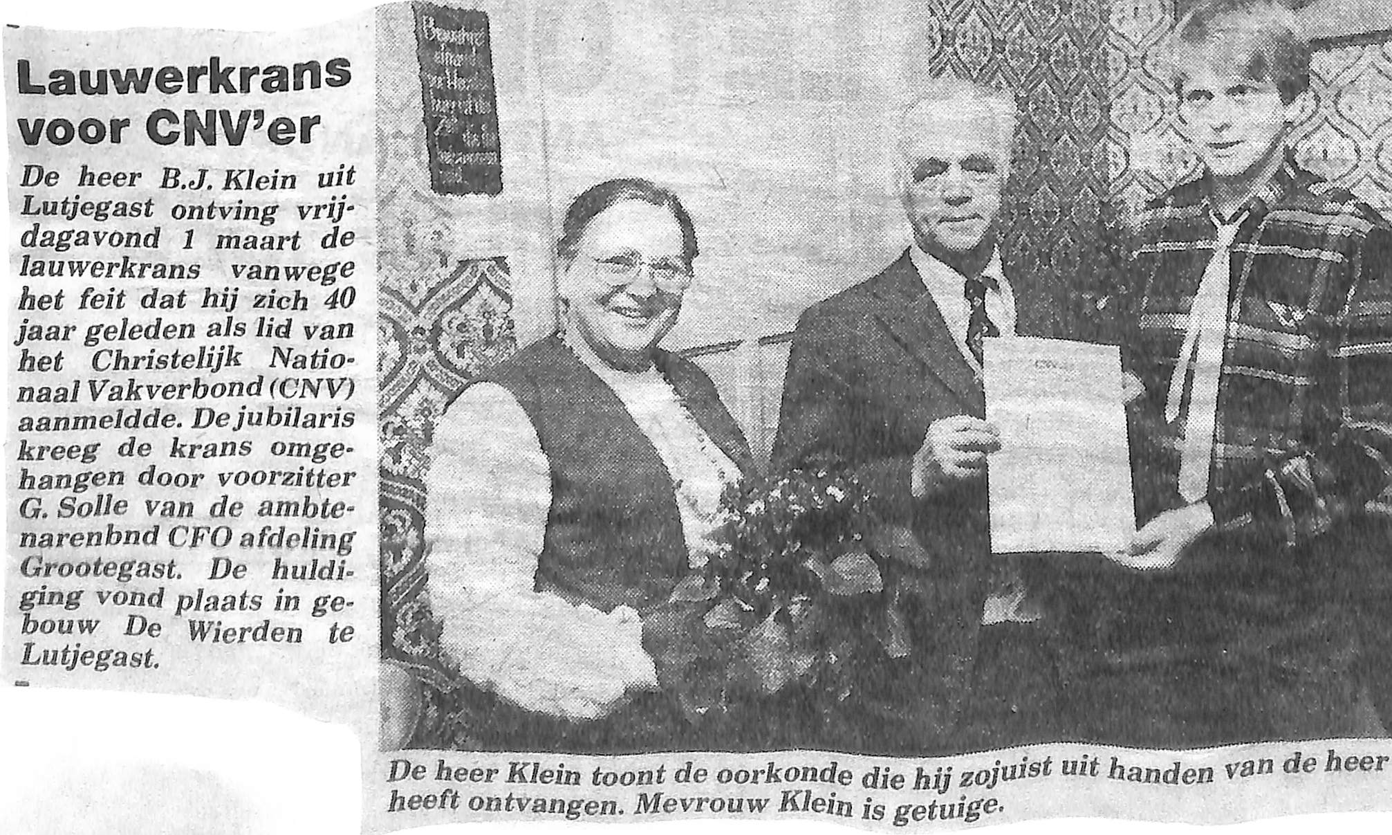 B. J. Klein ontvangt van G. Solle een oorkonde dat hij 40 jaar lid was van het CNV.