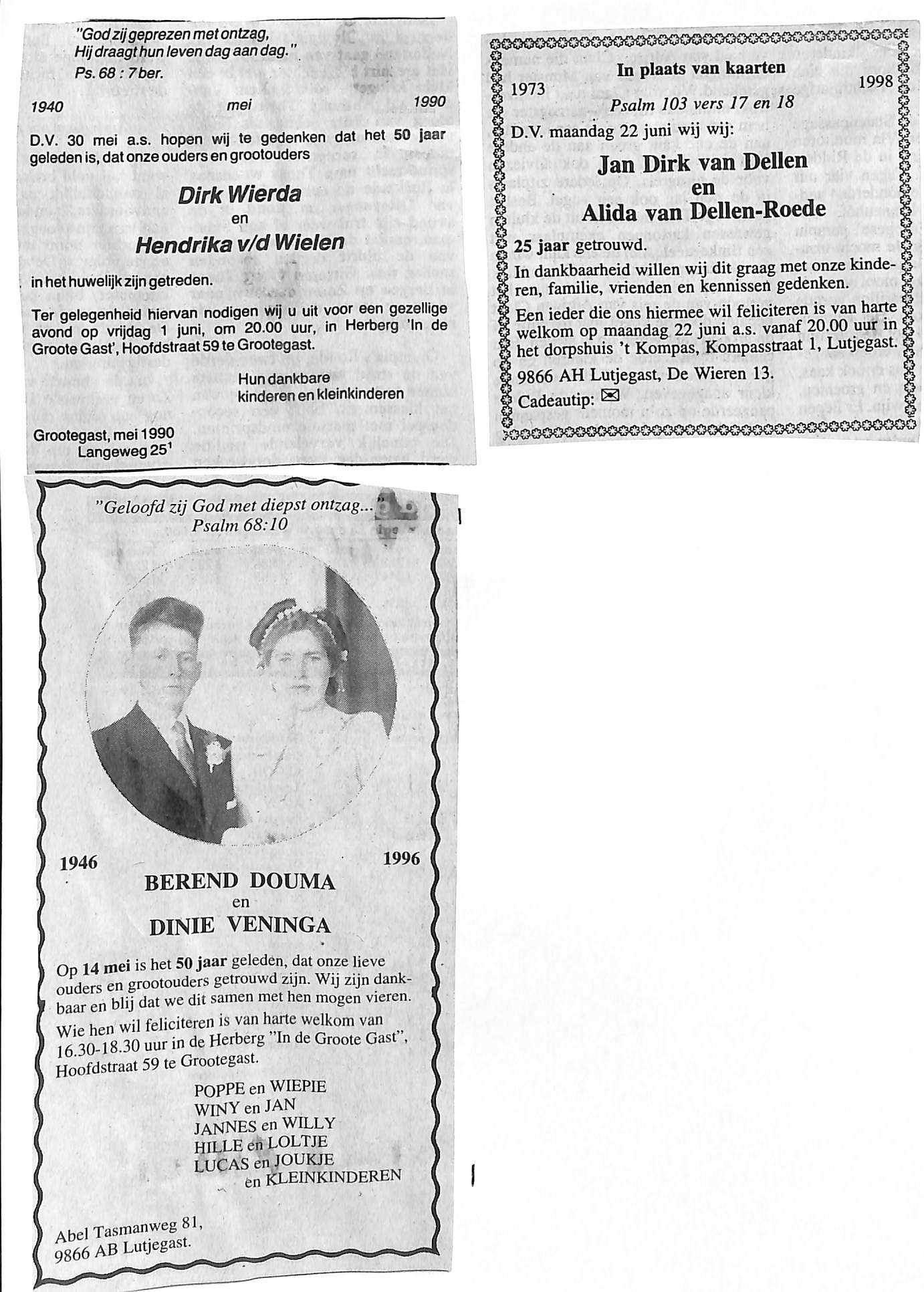 50 jaar getouwd; Dirk Wierda en Hendrika v/d Wielen, Berend Douma en Dinie Veninga