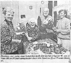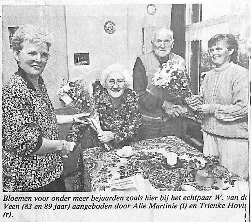 Bloemen voor bejaarden aangeboden bij het echtpaar van der Veen door Alie Martini en Trienke Hovius.