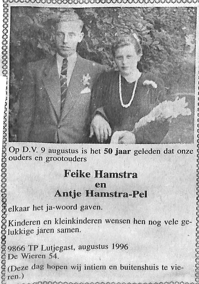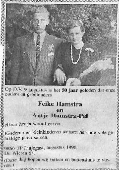Feike Hamstra en Antje Pel 50 jaar gehuwd op 09-08-1946