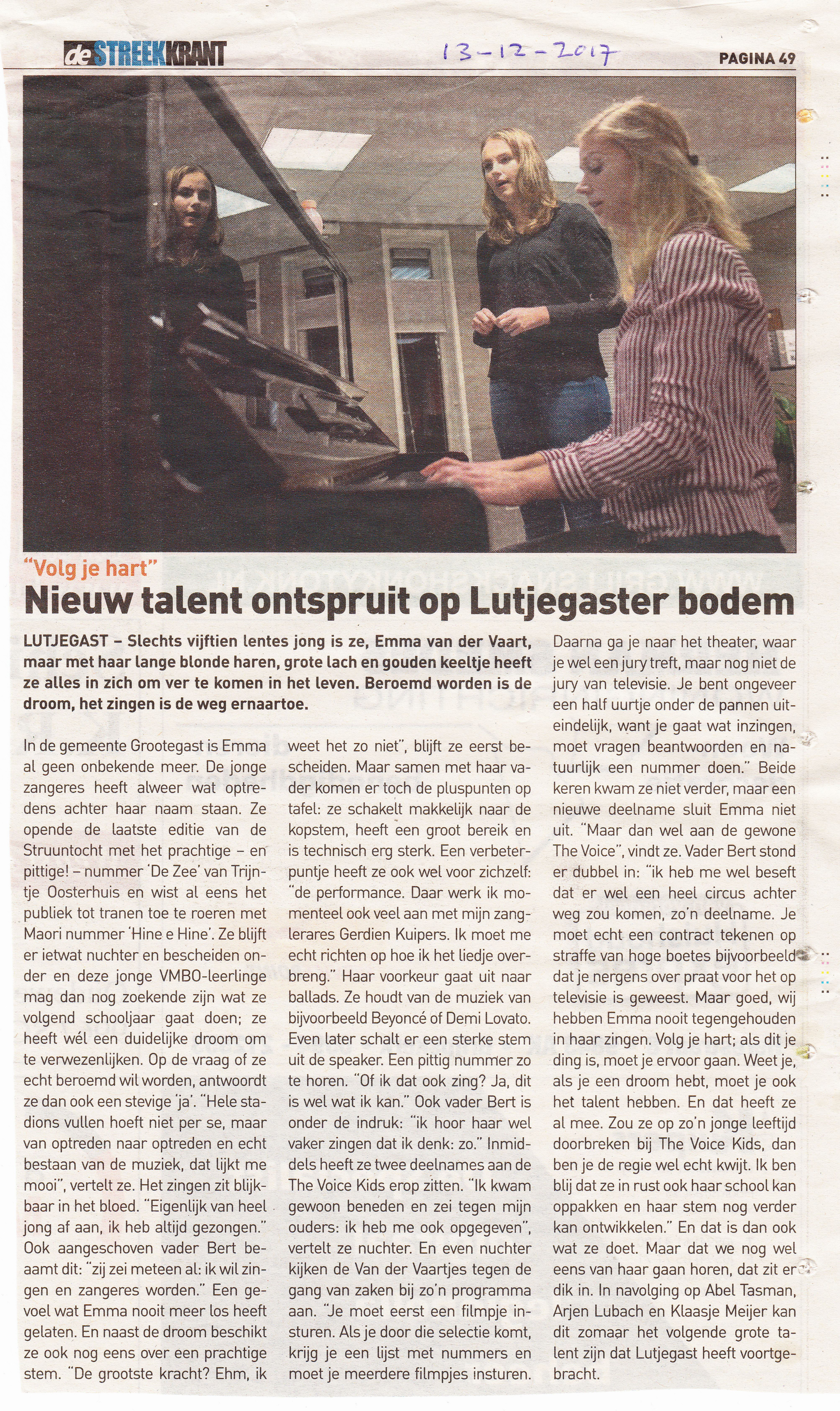 Emma van der Vaart, jong talent, wil graag gaan zingen.