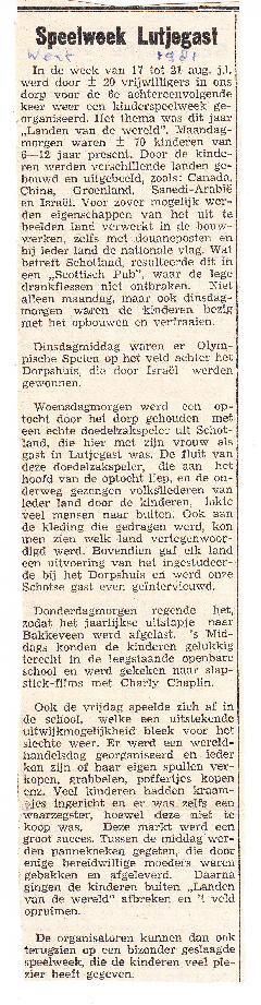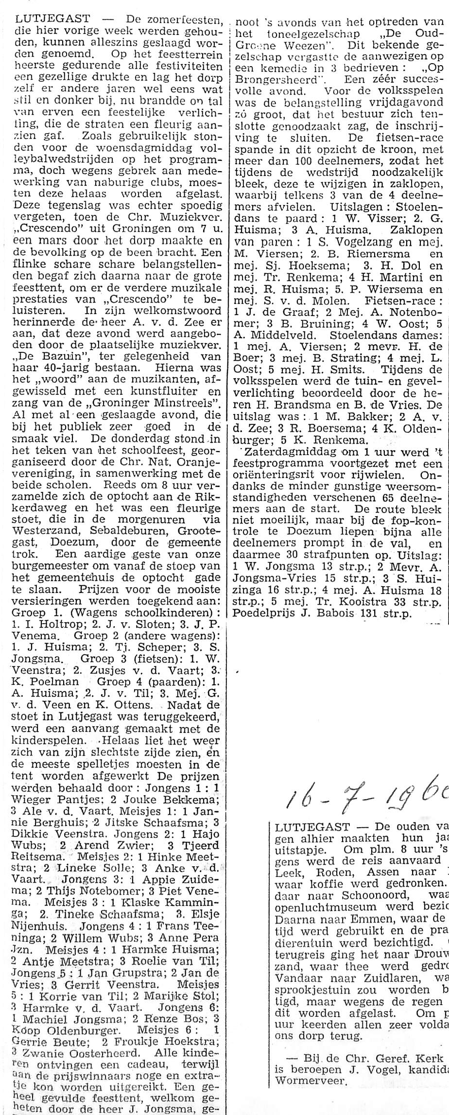 optocht, schoolfeest, prijzen voor schoolwagens, andere wagens, fietsen, paarden, kinderspelen, optreden toneelgezelschap "De Oud-Groene Weezen", ze spelen "Op Brongersheerd". Volksspelen met fietsenrace, zaklopen, stoelendans te paard, zaklopen van paren, stoelendans, oriënteringsrit voor rijwielen met fopcontrole