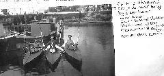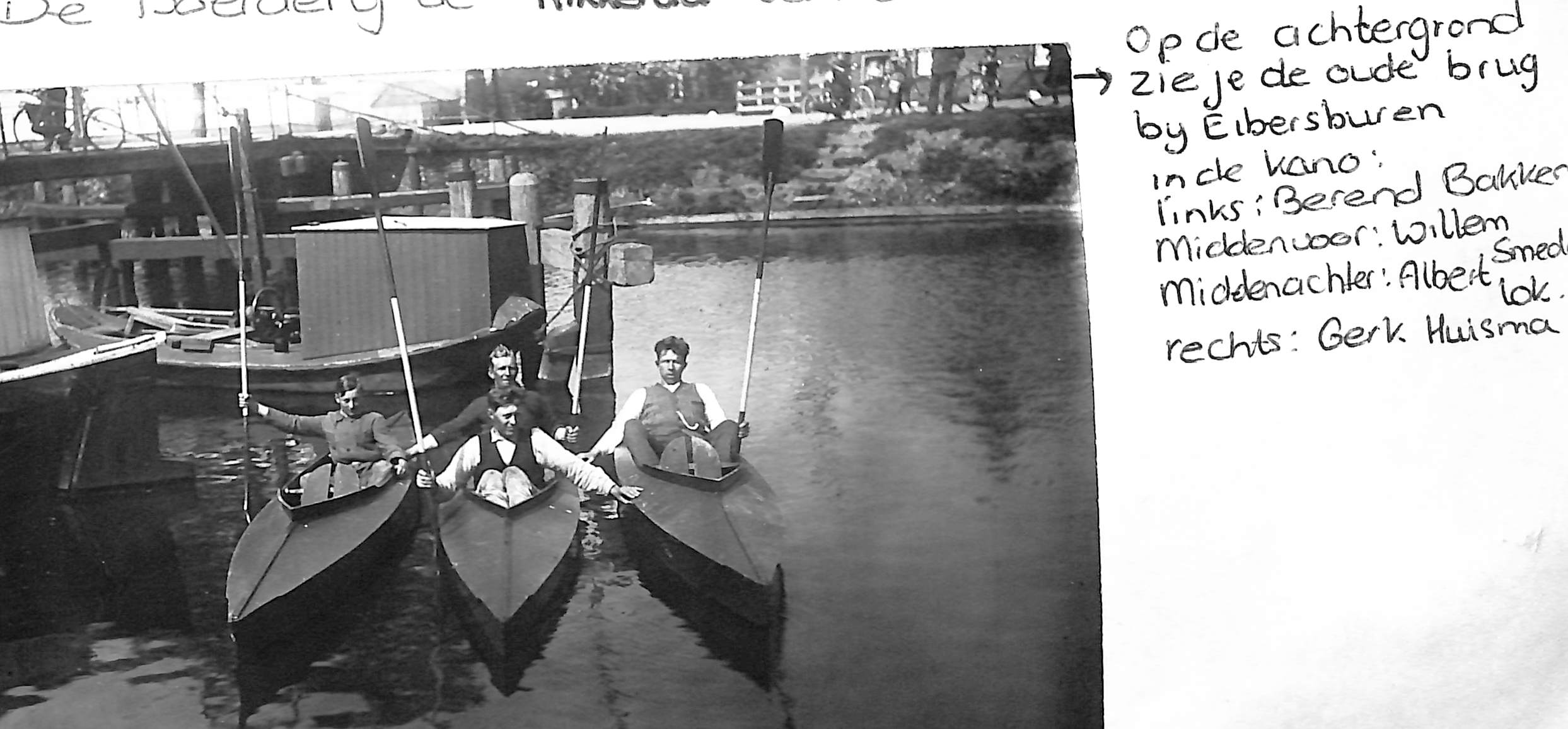 foto met 3 kano's Personen, Berend Bakker, willem Smeding(?) Albert Lok en Gerk Huisma