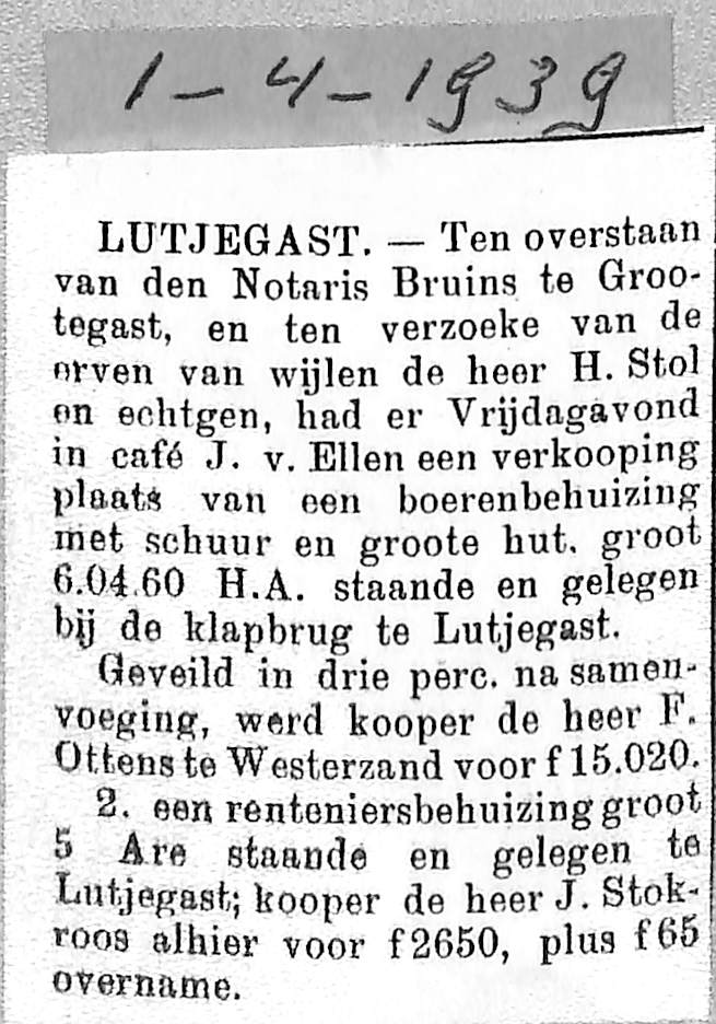 Namen: notaris Bruins, verkopers erven H.Stol, café J. van Ellen, koper F.Ottens, koper J. Stokroos