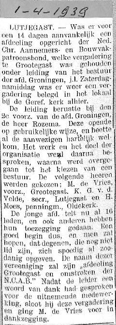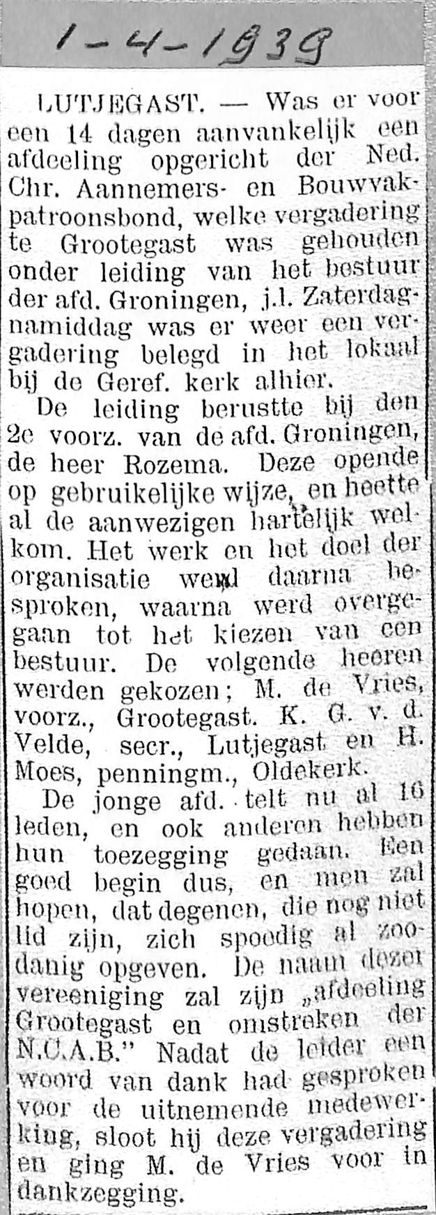 Verkiezing bestuur van de "afdeeling Grootegast en omstreken der N.C.A.B.", voluit: Ned. Chr. Aannemers- en Bouwvakpatroonsbond