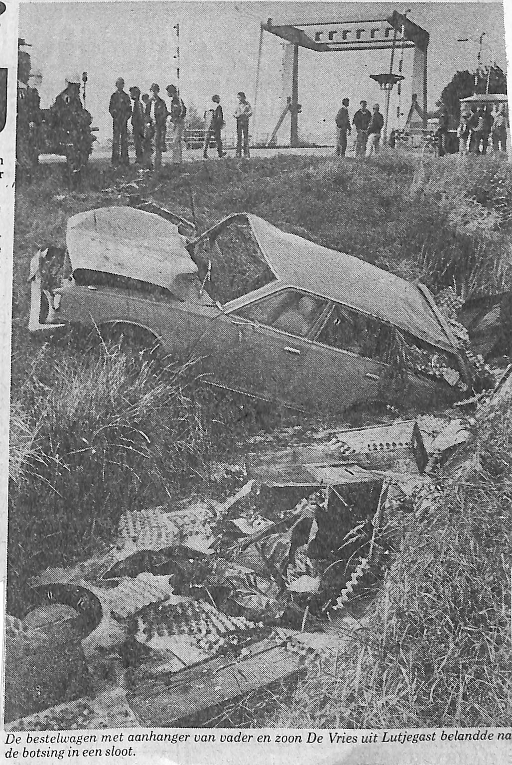 bestelwagen met aanhanger vader de Vries en zoon uit Lutjegast in sloot na botsing