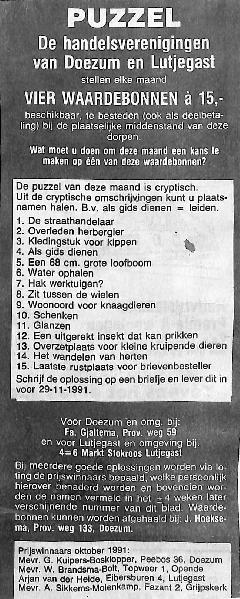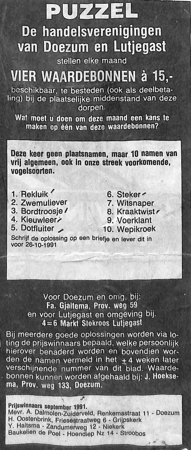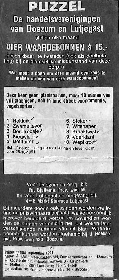 4 waardebonnen van 15,- gulden beschikbaar door de handelsvereniging van Lutjegast en Doezum, bedrijven die meedoen, Stokroos, J.v.d. Molen, Notebomer, Gjaltema, Dijkstra, Top, Oldenburger, Snip, Henriette , Schreiber en winnaars vorige keer,