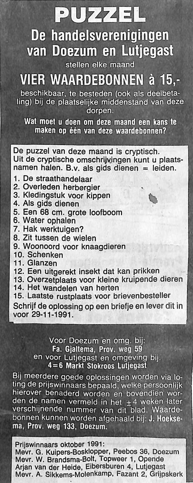 puzzel van de maand, bedrijven Stokroos, v.d. Bijl, Top, Snip, Schreiber, Gjaltema, Dijkstra, Froentjes, Krijthe, Henriette en winnaars jan. 1992 S.Bolt-de Bruin Doezum, W. Zuiderveld Kornhorn, A.Sikkens-Molenkamp Grijpskerk, A. Postma Lutjegast