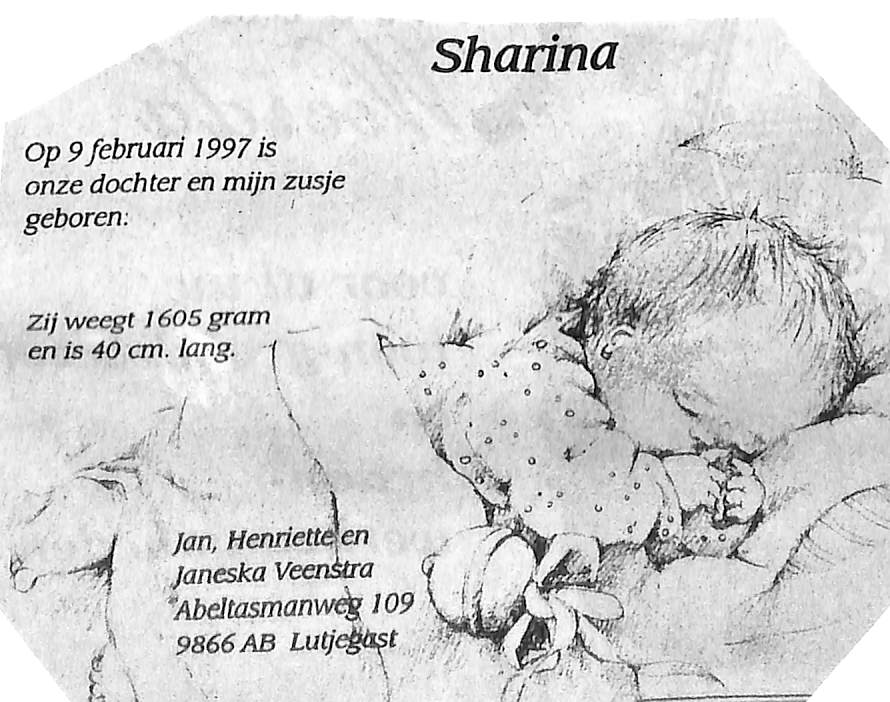 Sharina Veenstra 09-02-1997, dochter van Jan en Henriƫtte Veenstra.