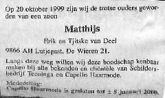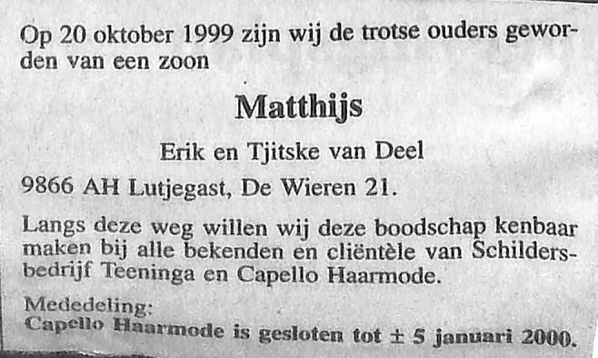 Matthijs van Deel, kind van Tjitske en Erik van Deel op 20-10-1999