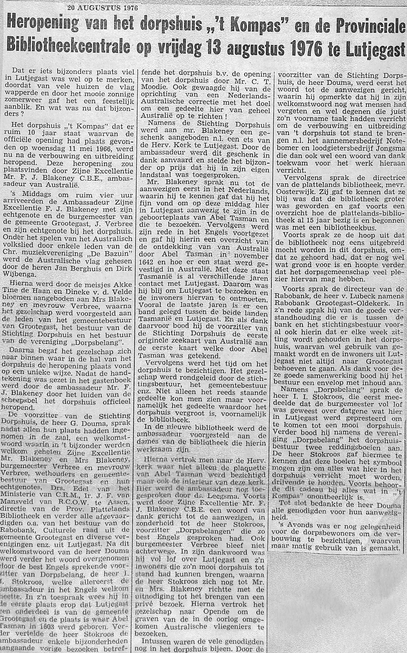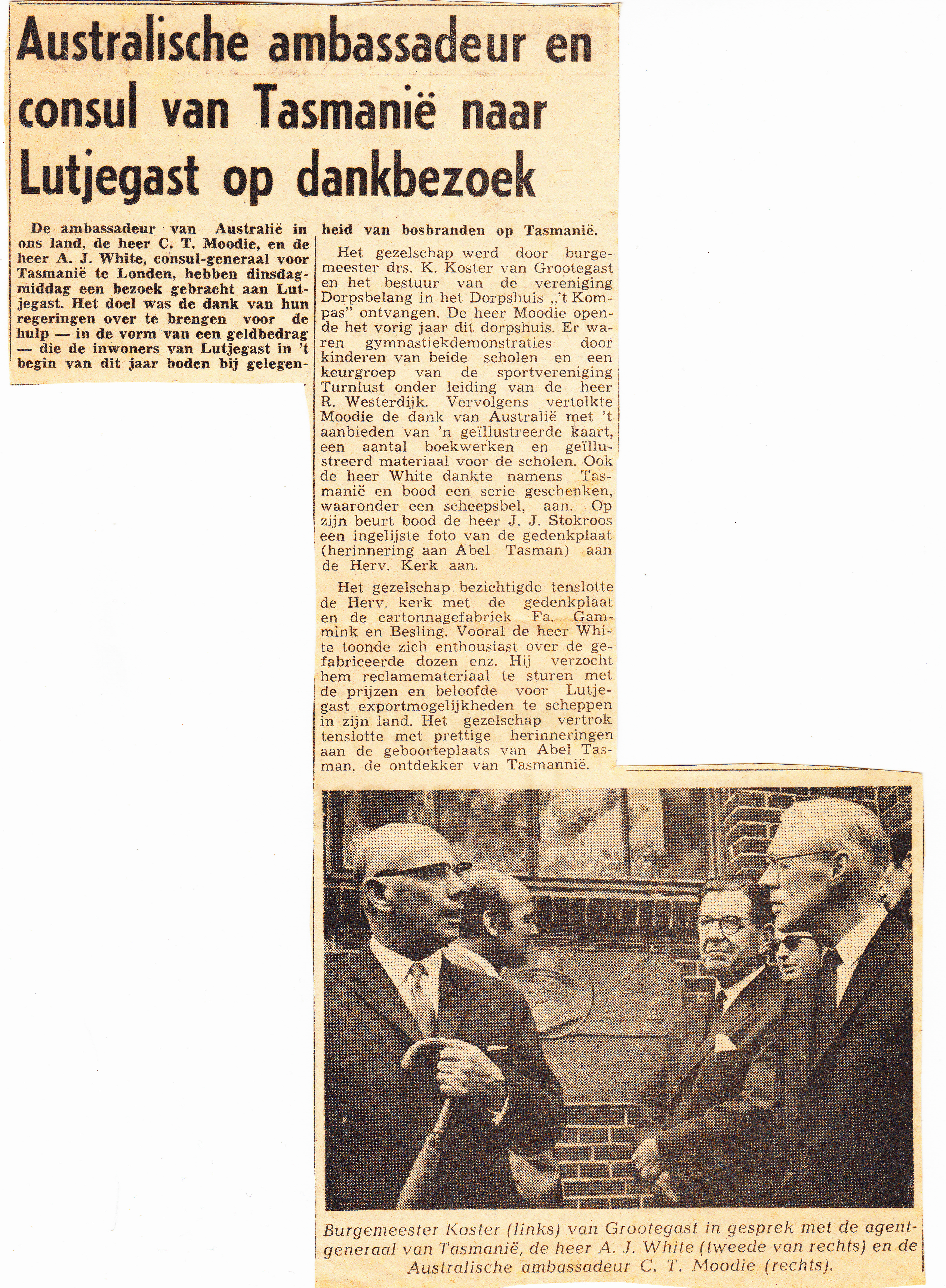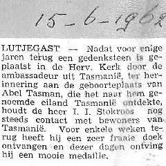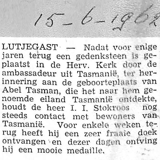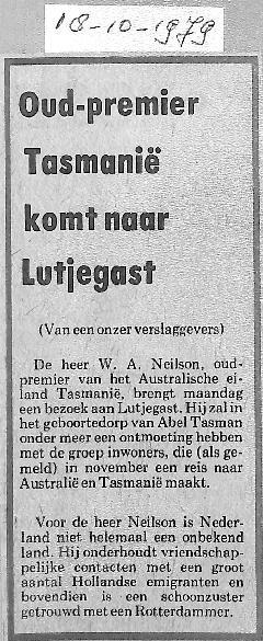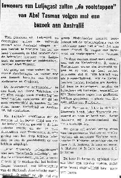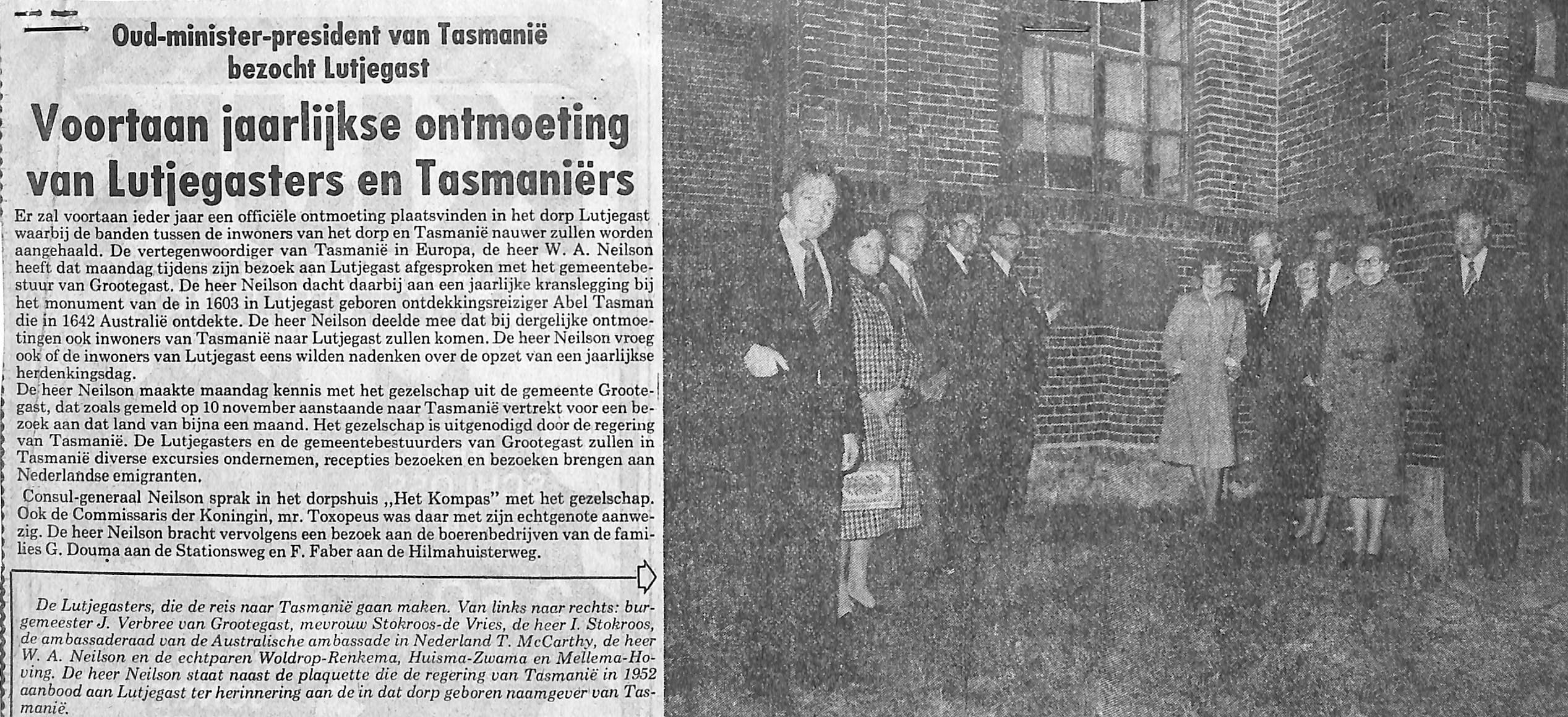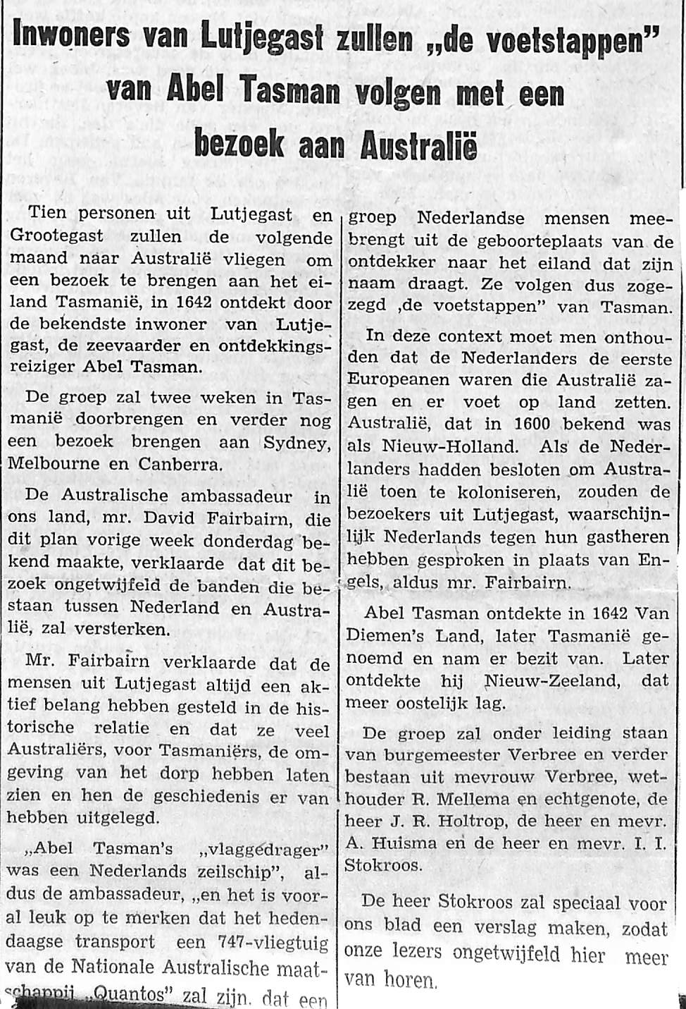 10 personen uit Lutjegast en Grootegast zullen naar Australië vliegen om een bezoek te brengen aan het eiland Tasmanië; David Fairbairn, J. Verbee, R. mellema, J. R. Holtrop, A. Huisma, I. I. Stokroos