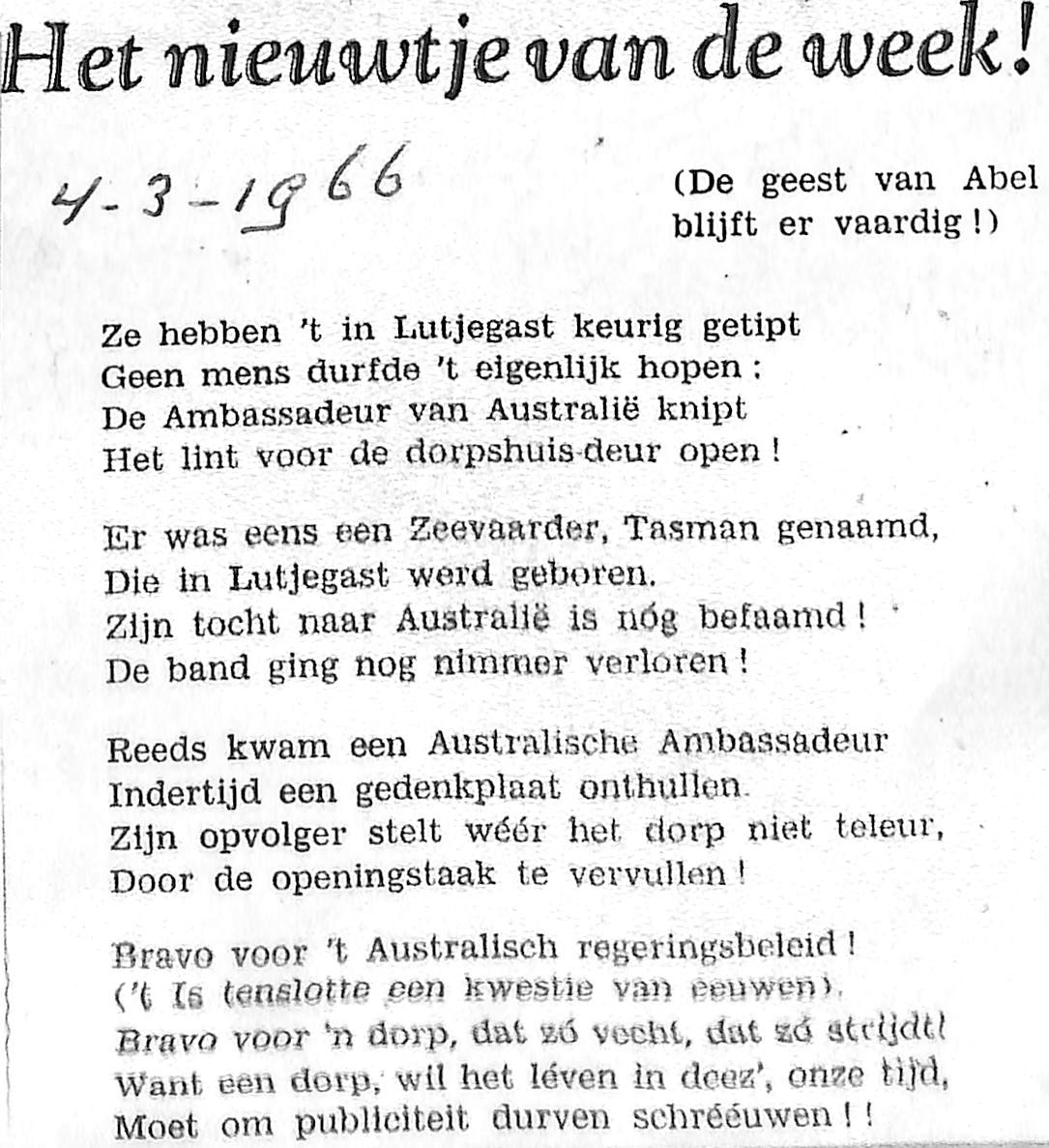 Ambassadeur Nieuw Zeeland bezoekt o.a. Lutjegast omdat Abel Tasman 327 jaar geleden voet aan wal zette in Melson, N.Z. Is daar nationale feestdag