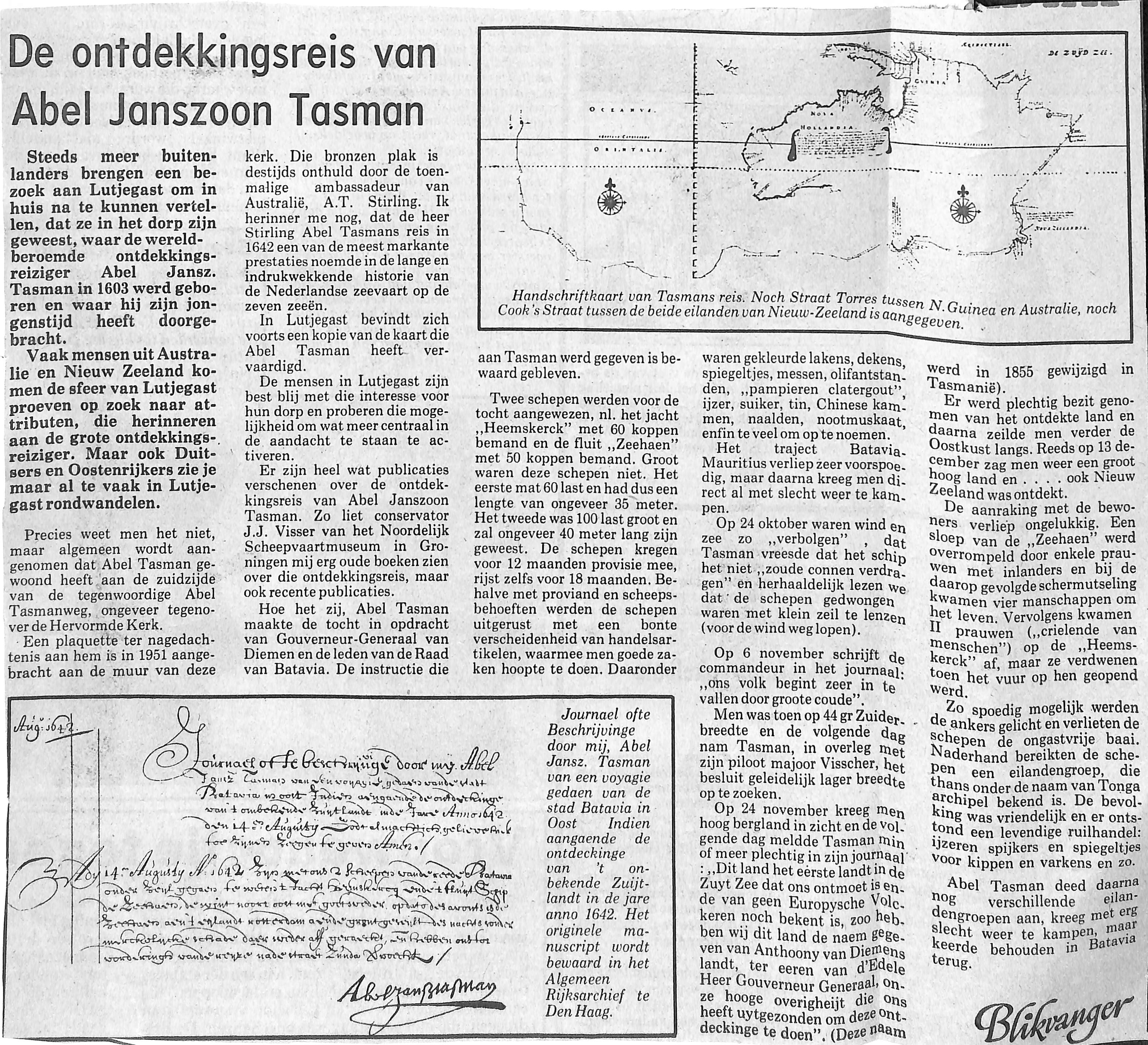 Een uitvoerige beschrijving in krantenartikel over de beroemde ontdekkingsreis van Abel Tasma in 1642/1643