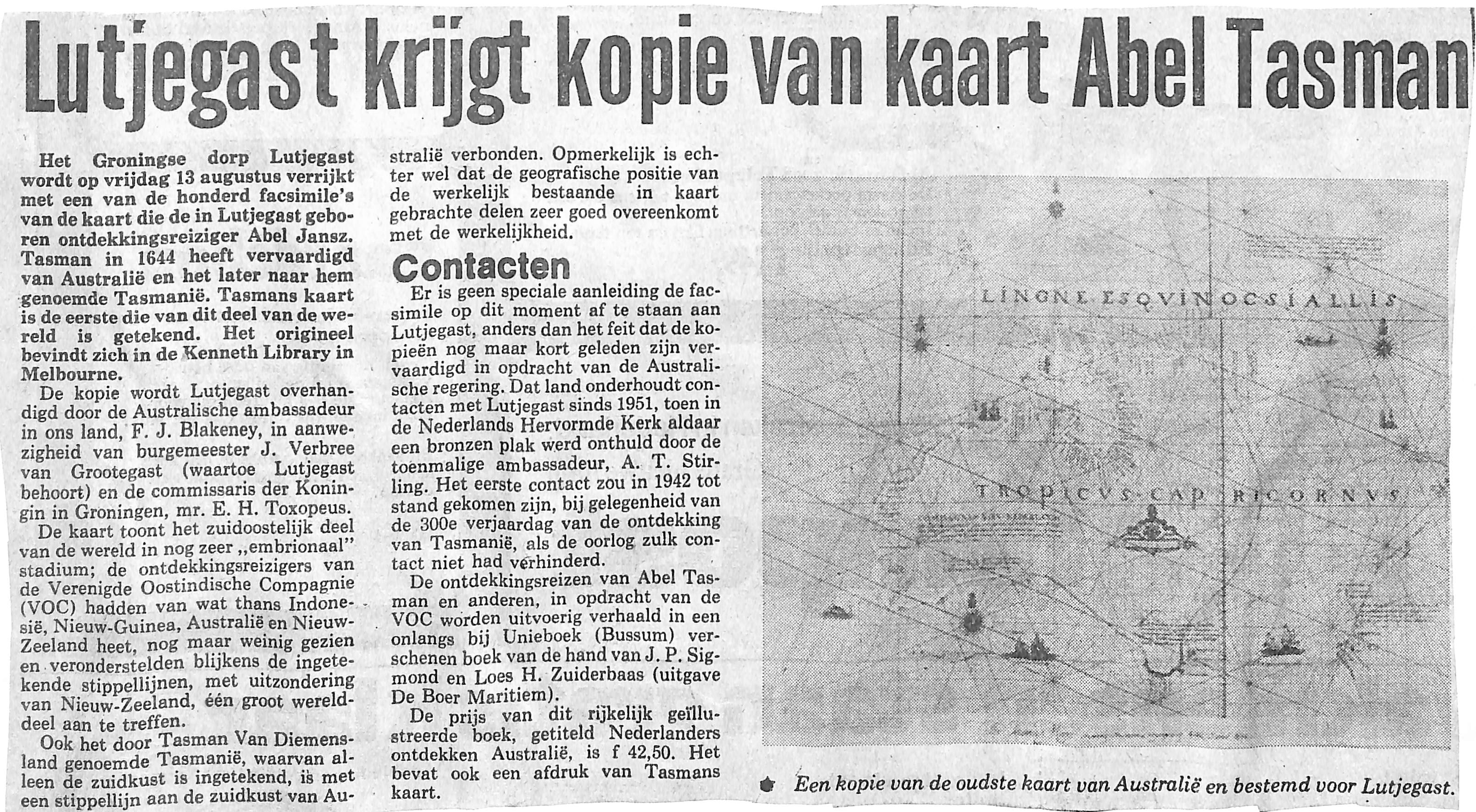 Lutjegast krijgt een kopie van de eerste kaart van Australië, F.J Blakeney; J. Verbree: E.H Toxopeus; A.T. Stirling