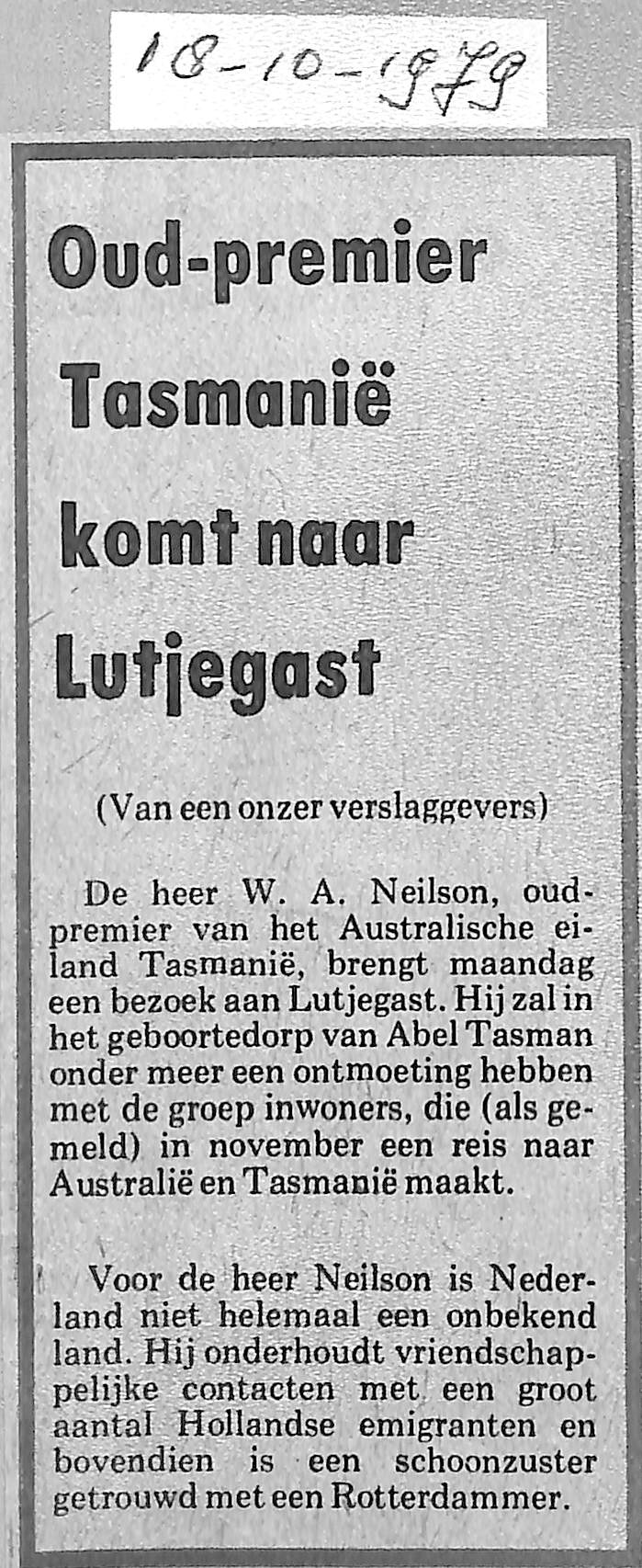 W.A. Neilson, premier van Tasmanië, brengt bezoek aan Lutjegast