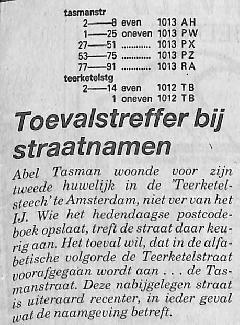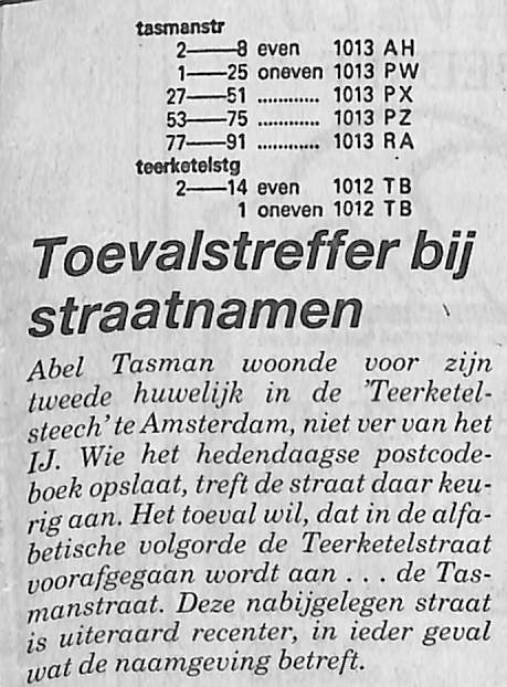 In Amsterdam volgen in het postcodeboek de Abel Tasmanstraat en de Teerketelsteeg achter elkaar.