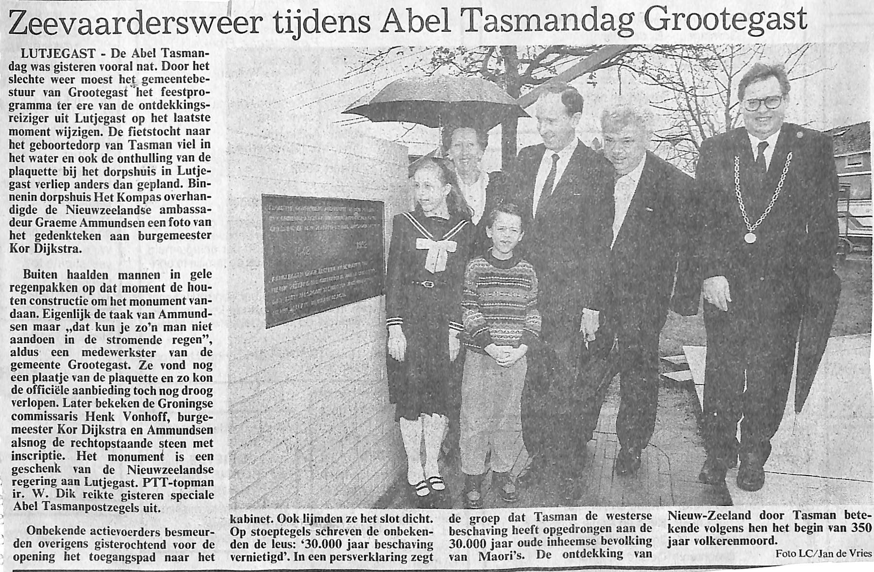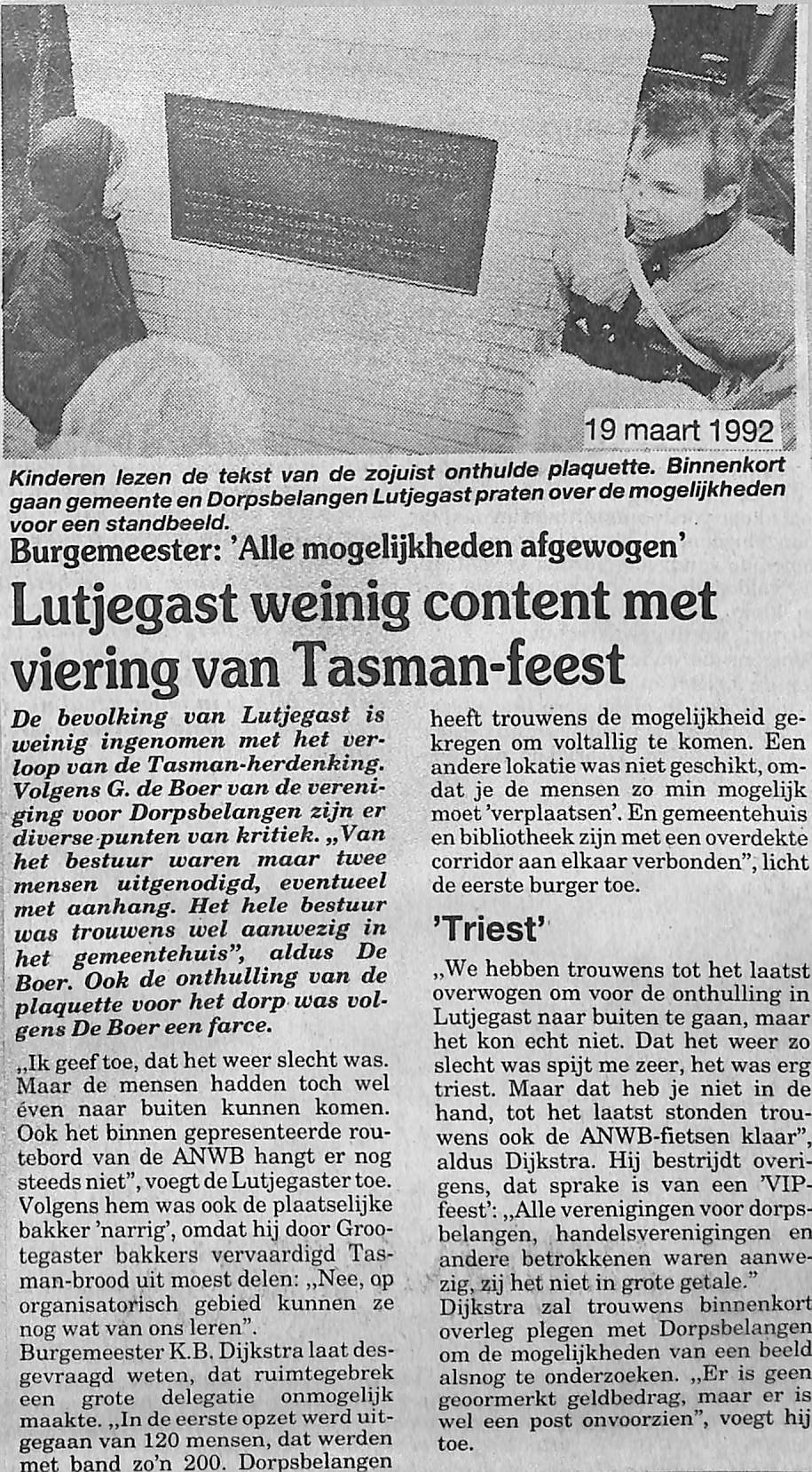 K. de Wagt, twee leden dorpsbelangen van Lutjegast, twee beeldende kunstenaars, A. van Eupen en J. Klompien.