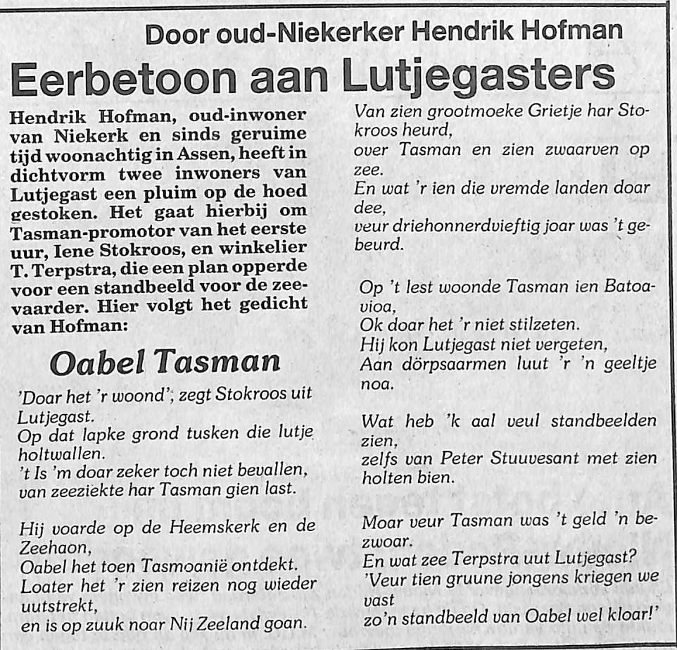 Hendrik Hofman zet twee Lutjegasters pluim op de hoed in een gedicht. nl.