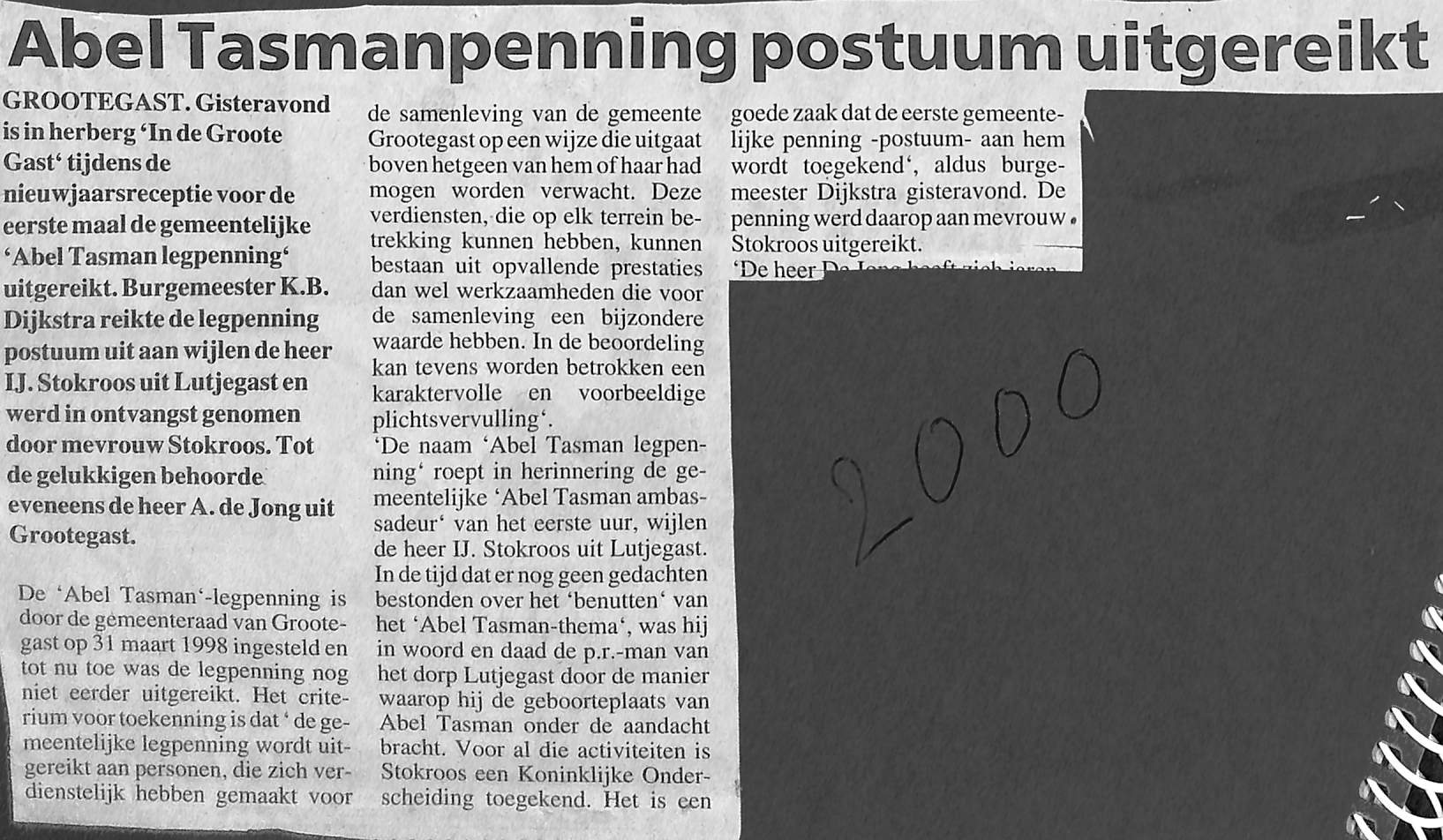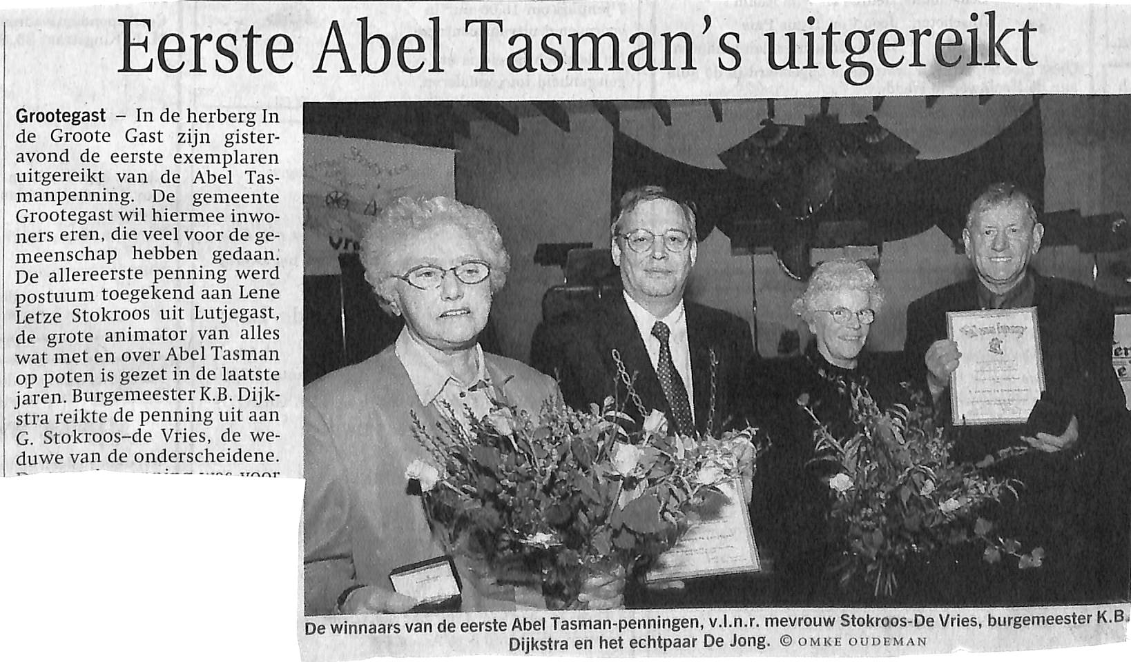 Tasmanpenning voor de eerste keer posthuumgegeven aan Iene Stokroos,