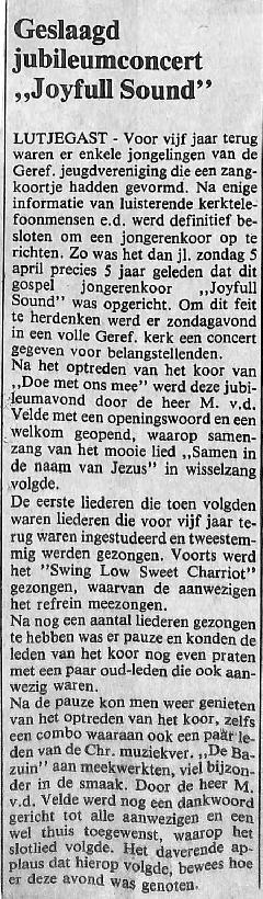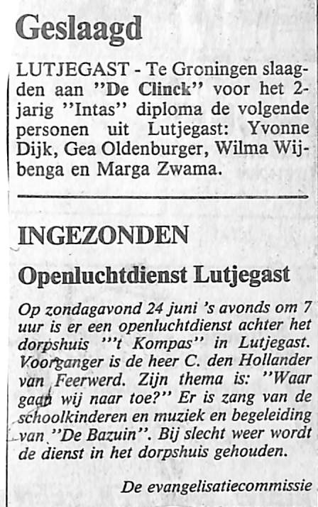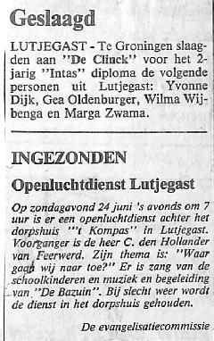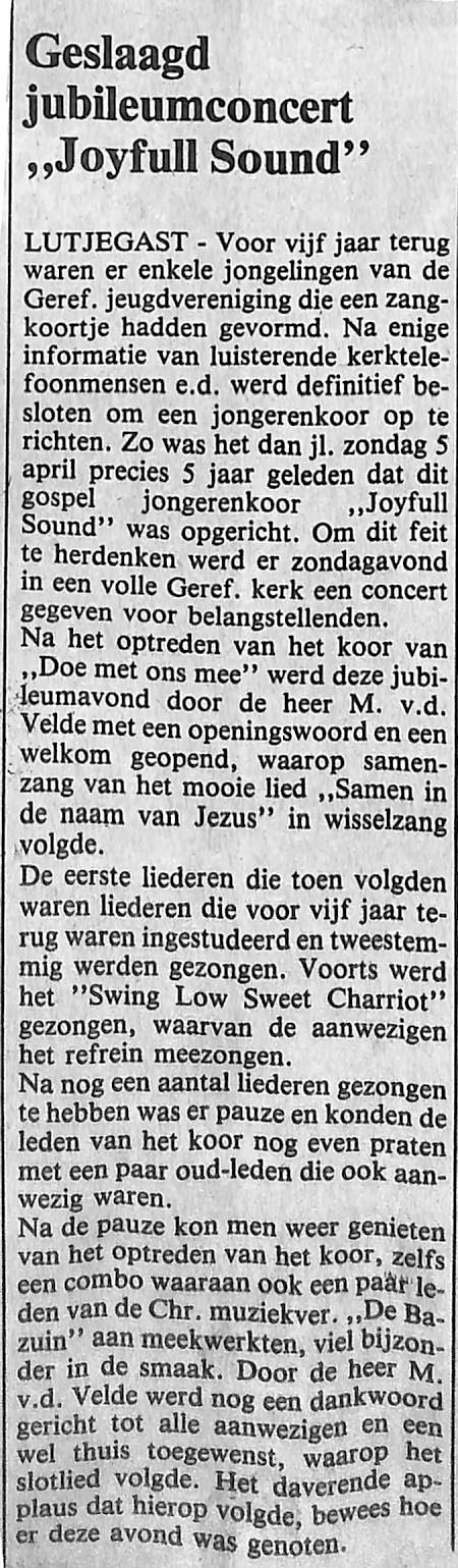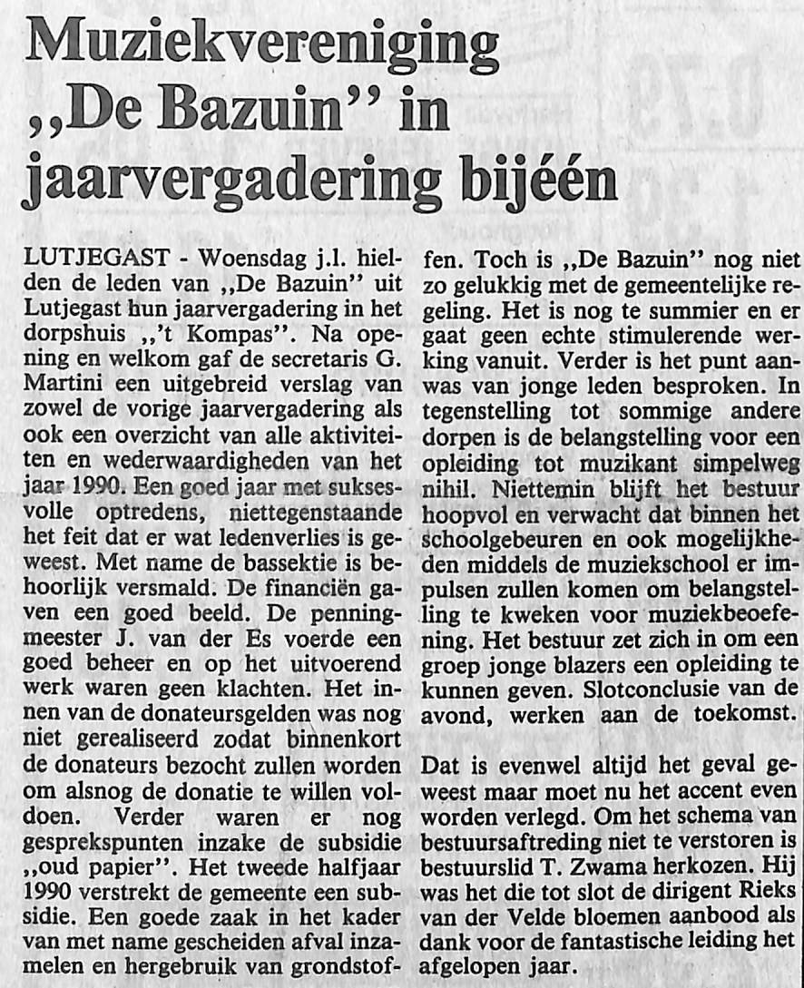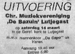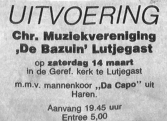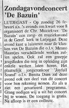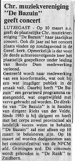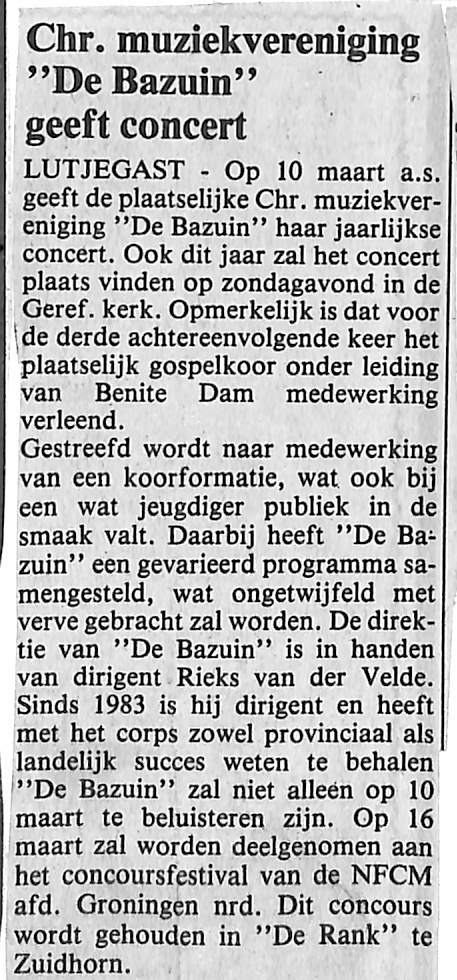ter gelegenheid van het 70-jarig bestaan van de Muziekvereniging De Bazuin werd er een concert gegeven; H v/d velde, T. Fabriek, Anne Oost, Jochum de Vries, Bert Vink, Bert v/d Velde, D. Dijkstra, Rieks v/d Velde, Benita Dam, Auke de Haan,