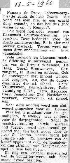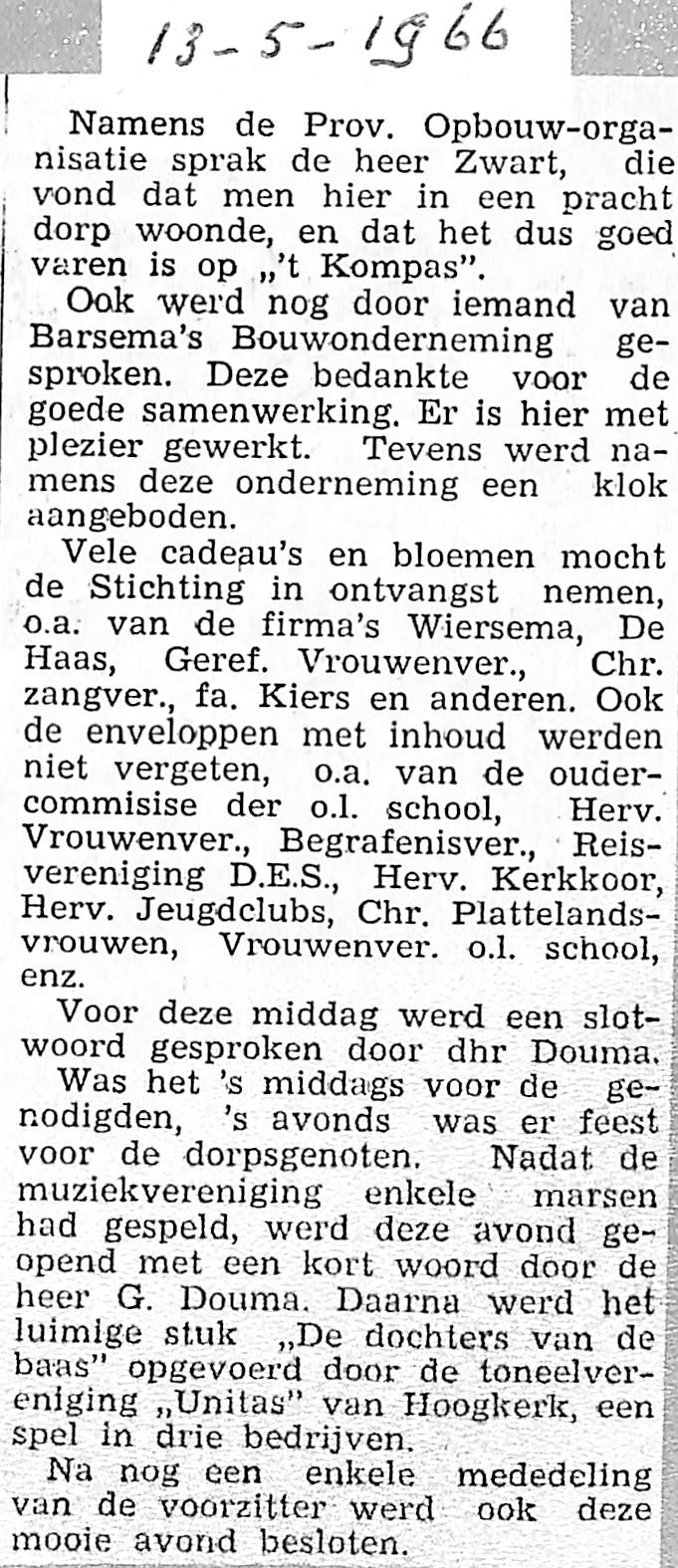 's-Avonds feest voor het dorp met muziek van De Bazuin en Toneelver. Unitas uit Hoogkerk speelt blijspel "De dochters van de baas".