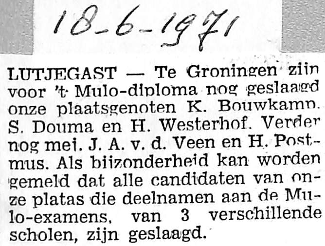 Mulo-diploma, S. Douma, H. Westerhof, J. A. van der Veen, H. Postmus