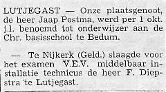 F. Diepstra slaagde voor het examen V.E.V. middelbaar instalatie technicus