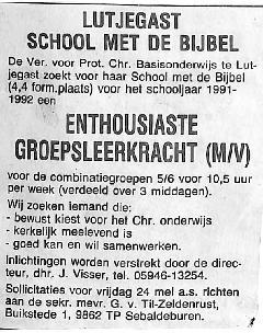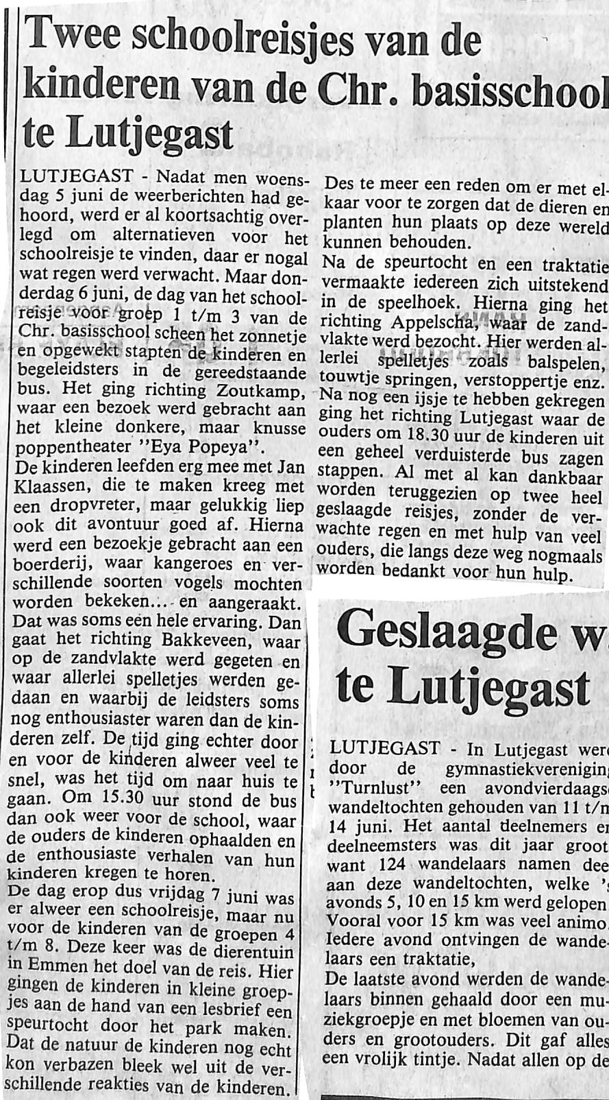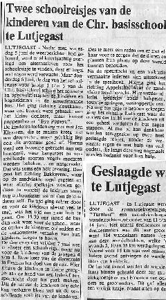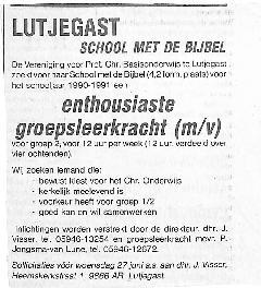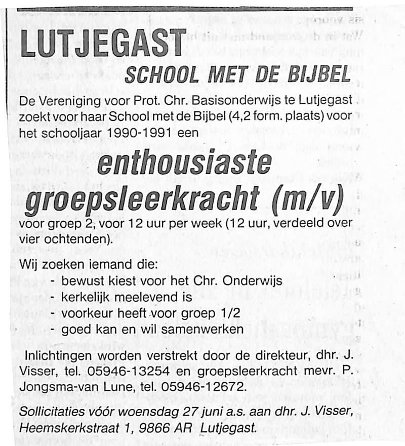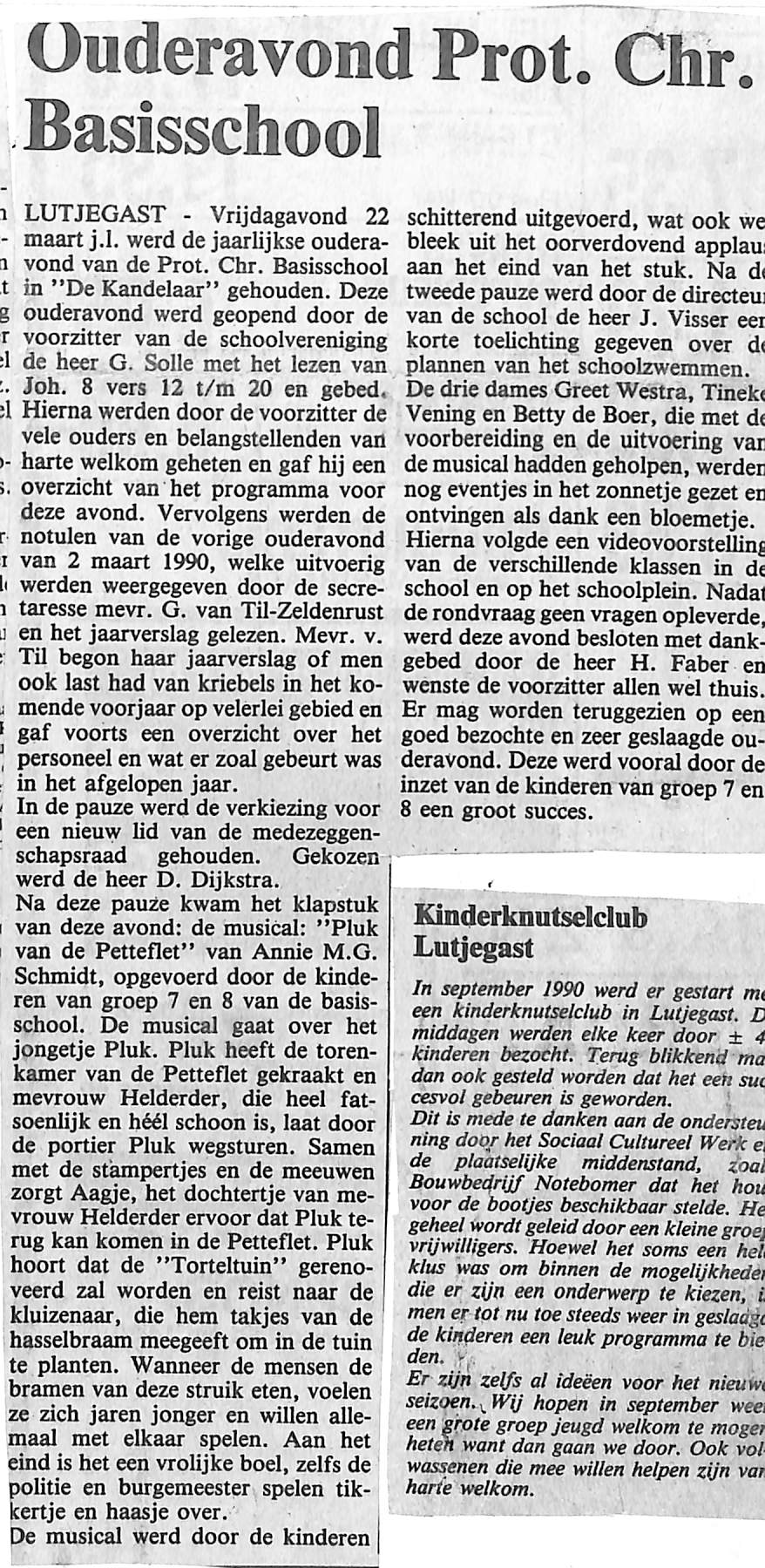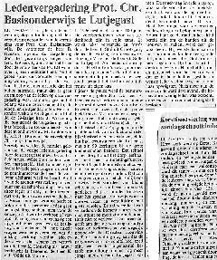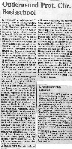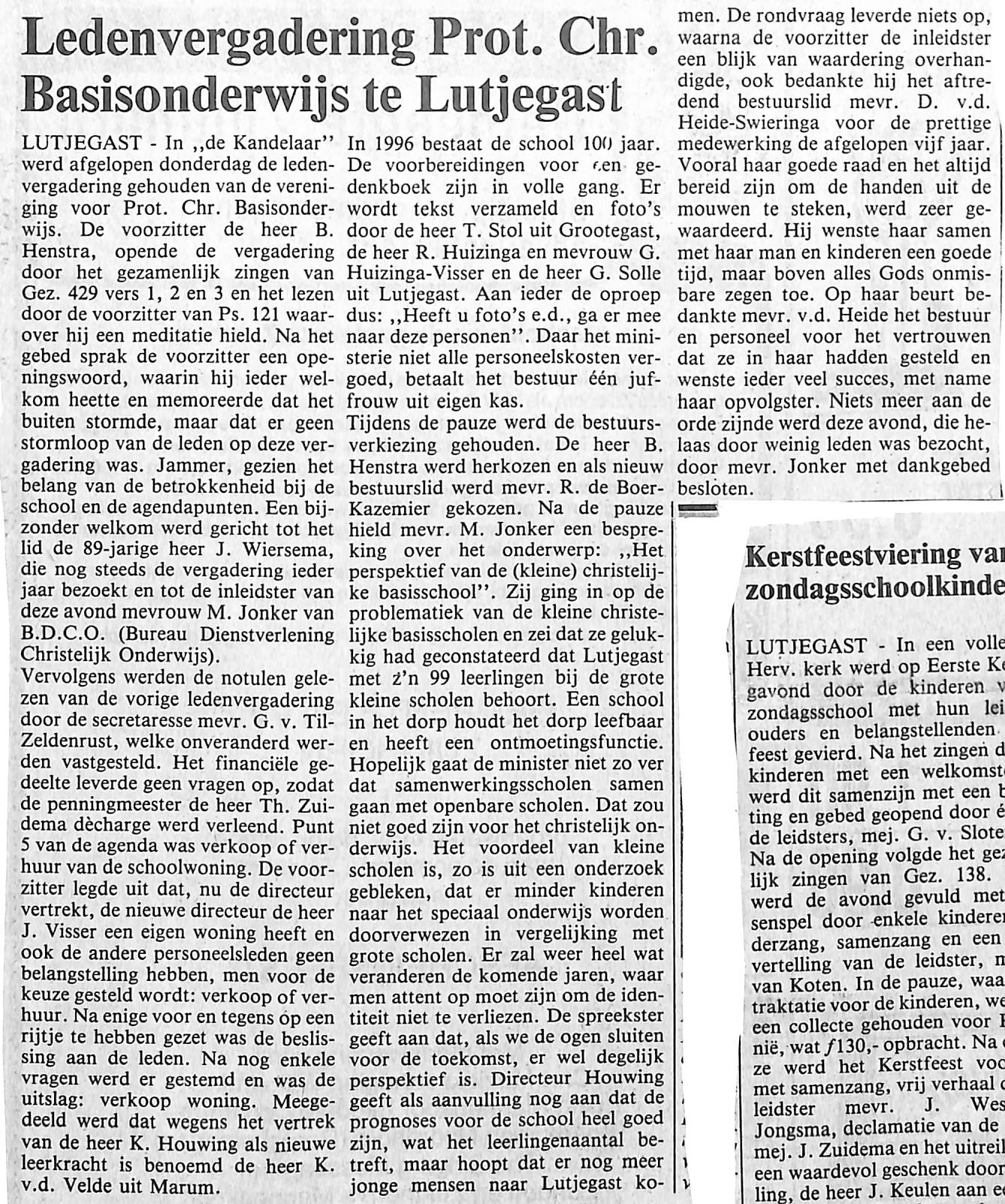 Tijdens de ledenvergadering van Prot. Chr. Basisonderwijs werden de notulen gelezen door mevr. G. v. Til- Zeldenrust, penningmeester Th. Zuidema had geen bijzonderheden. De verkoop/verhuur van de schoolwoning werd besproken omdat de nieuwe directeur J. Visser al over een eigen woning beschikte.Ook werd afscheid genomen van leraar K. Houwing en een nieuwe leerkracht benoemd dhr. K. van der Velde. Vanwege het 100-jarige bestaan werden er text en foto's verzameld door dhr. T. Stol uit Grootegast, de heeer en mevrouw Huizinga en dhr. G. Solle. Tijdens de bestuursverkiezing werd dhr. B. Henstra herkozen en als nieuw bestuurslid mevr. R. de Boer-Kazemier.